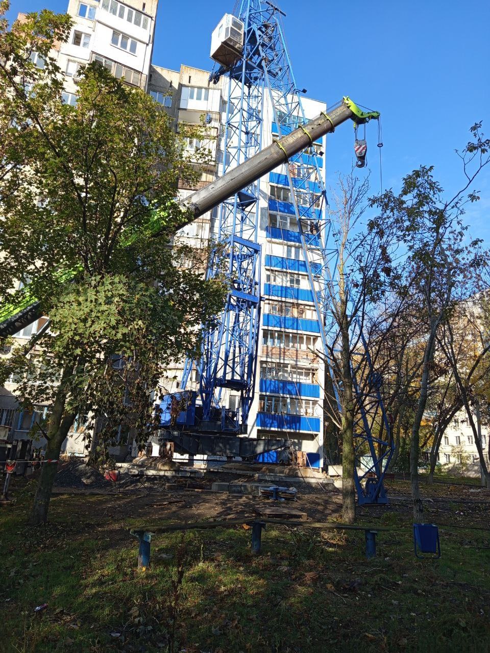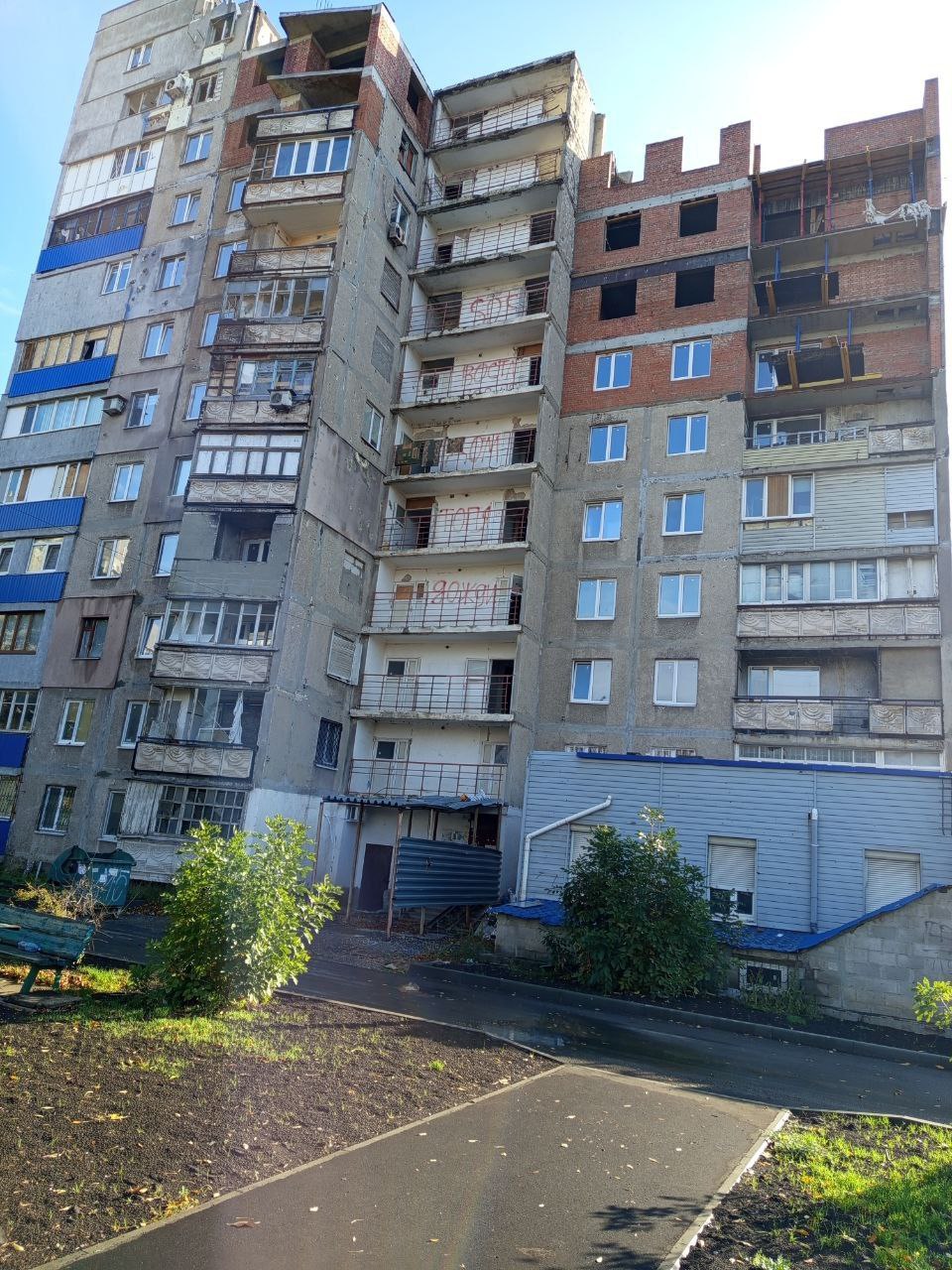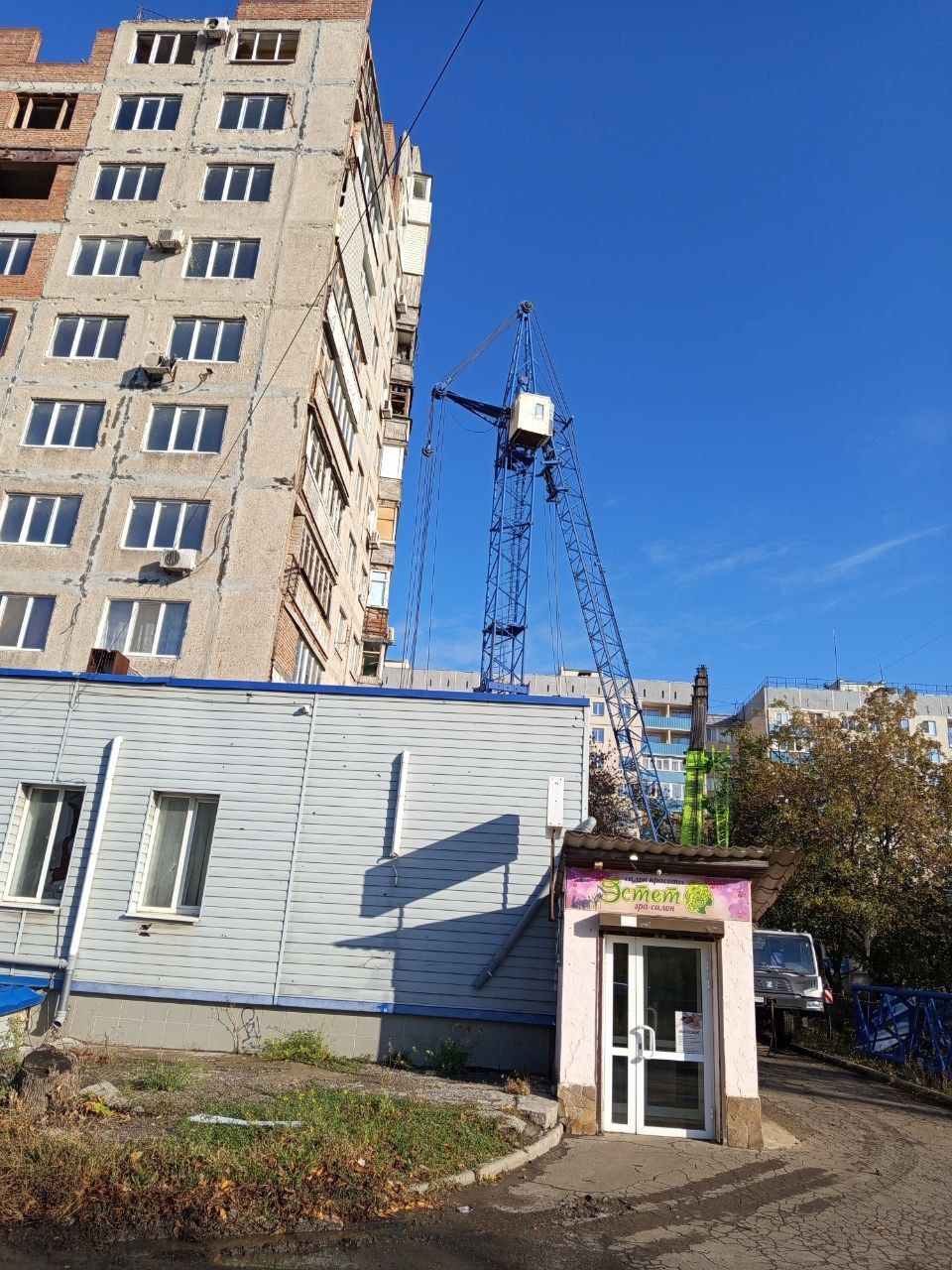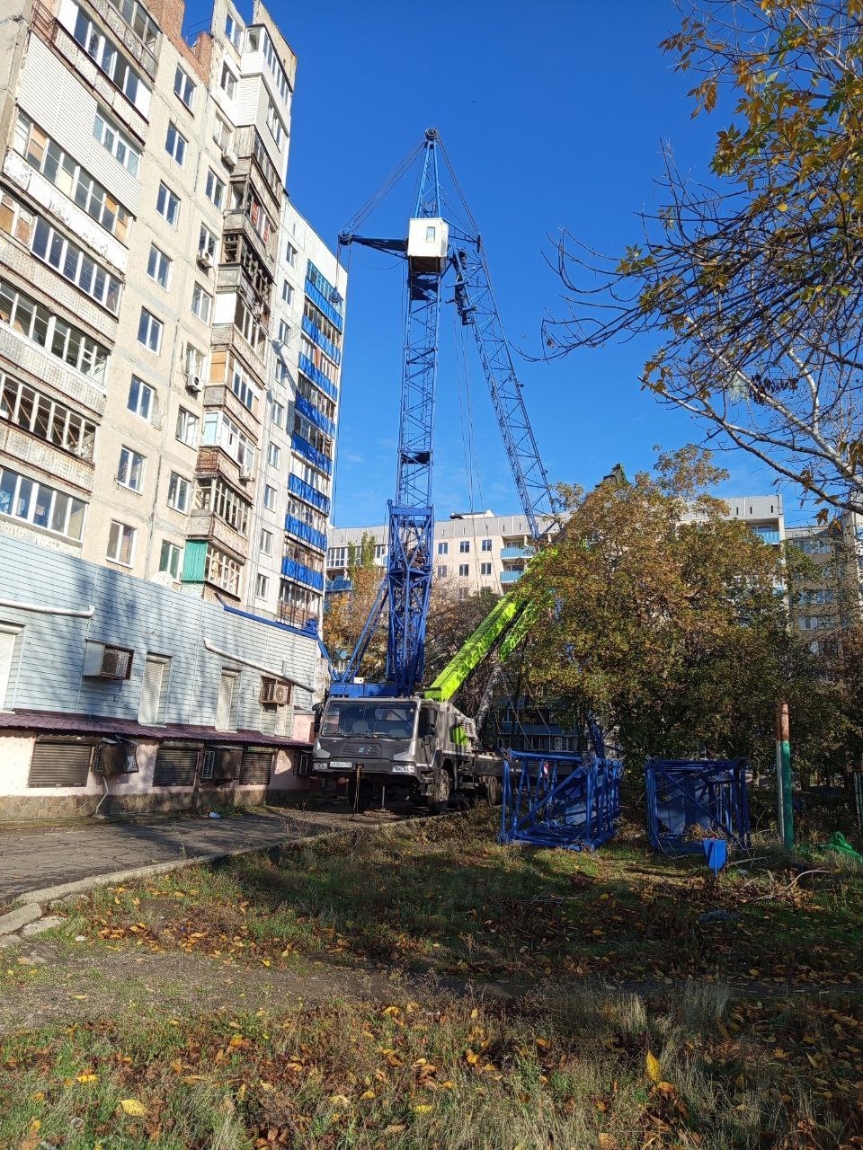 На пр. Победы, 110 скоро начнется очередной этап восстановления дома. Сейчас там идёт монтаж подъёмного крана. Часть дома необходимо достраивать - повреждения получены большие. Жители оставили надпись: "SOS дом топят дожди".
