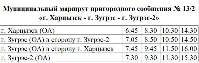 С 13 октября 2025 года по 31 октября 2025 года в ТЕСТОВОМ РЕЖИМЕ с понедельника по пятницу, запускается движение автобуса по муниципальному маршруту № 13/2 «г. Харцызск - г. Зугрэс- г. Зугрэс-2».