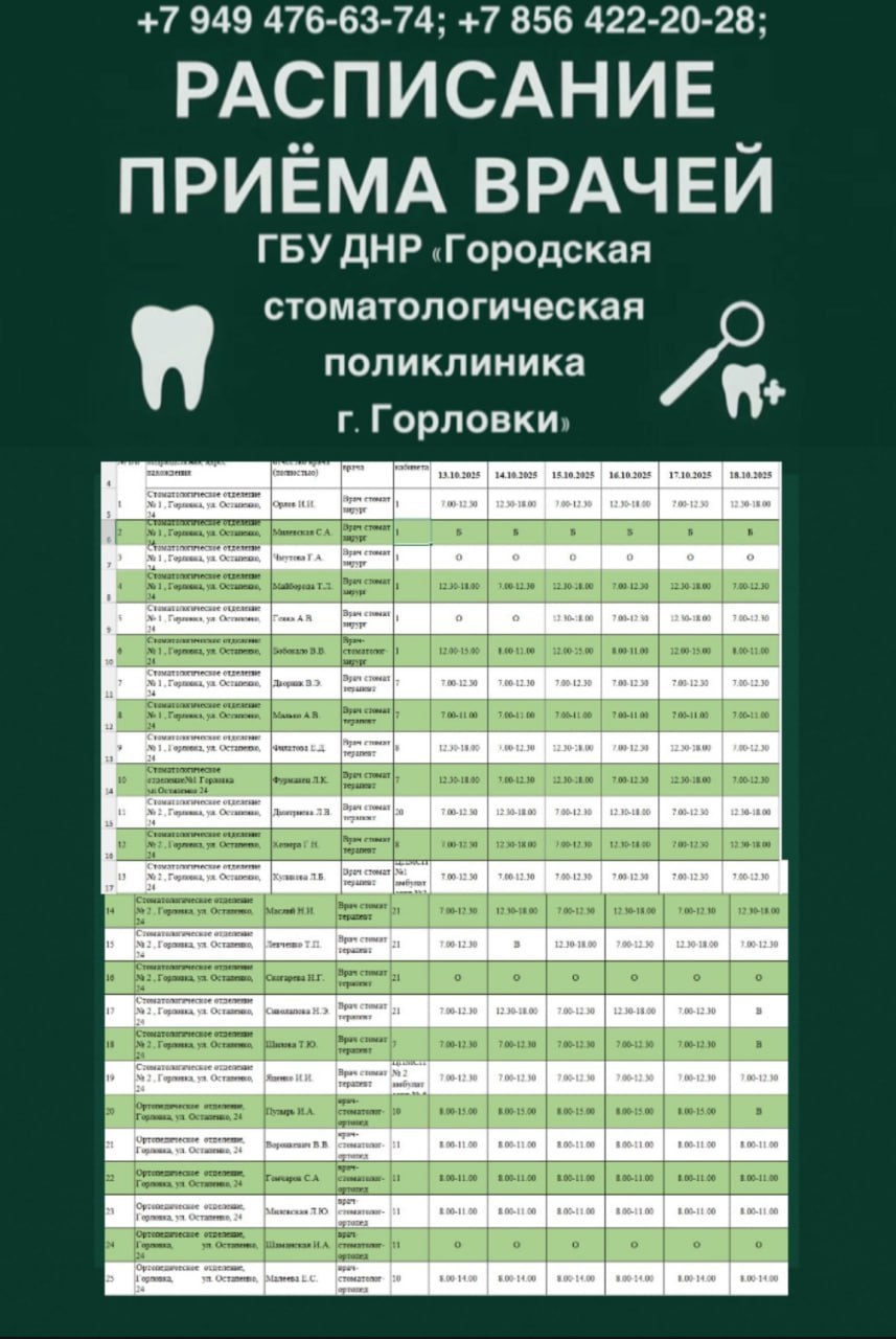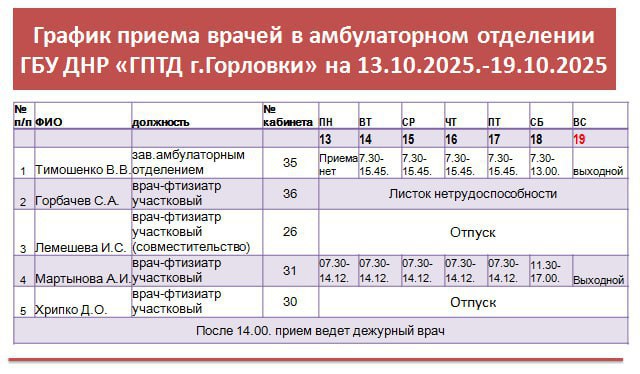 Иван Приходько: График работы специалистов ГБУ ДНР «ГДСП г.Горловки», ГБУ ДНР «Городской наркологический диспансер г. Горловки», ГБУ ДНР «ГПБ г. Горловки», ГБУ ДНР «ГПТД г.Горловки», ГБУ ДНР «ГДВД г.Горловки», ГБУ ДНР «ГСП...