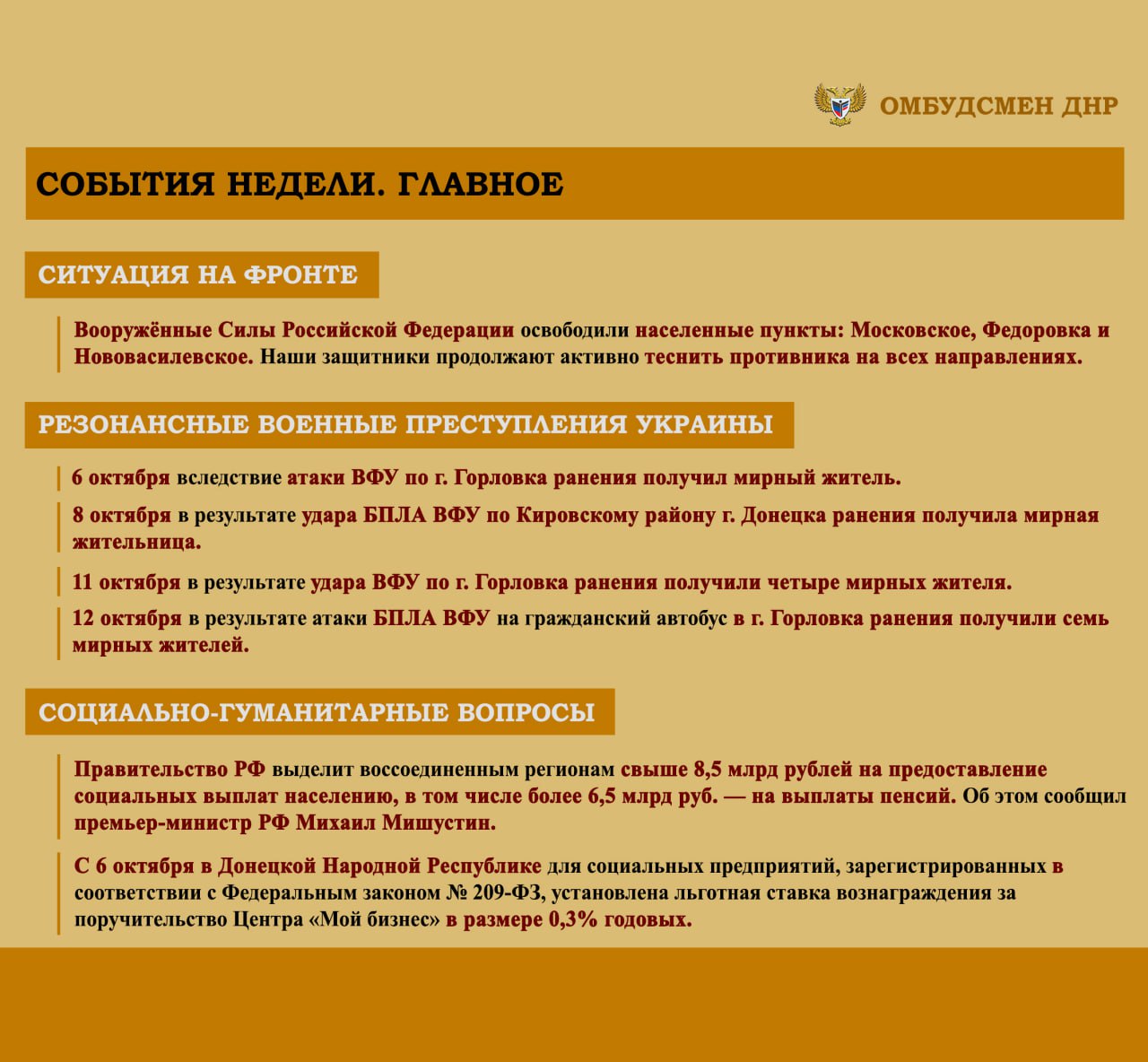 Дарья Морозова: ОБЗОР СОЦИАЛЬНО-ГУМАНИТАРНОЙ СИТУАЦИИ, СЛОЖИВШЕЙСЯ НА ТЕРРИТОРИИ ДОНЕЦКОЙ НАРОДНОЙ РЕСПУБЛИКИ ВСЛЕДСТВИЕ ВОЕННЫХ ДЕЙСТВИЙ В ПЕРИОД С 7 ОКТЯБРЯ ПО 13 ОКТЯБРЯ 2025 г