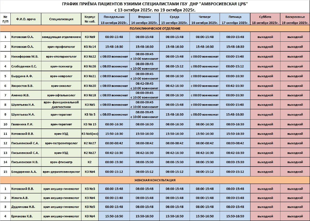 Игорь Лызов: График приема врачей поликлинического отделения ГБУ ДНР "Амвросиевская ЦРБ"