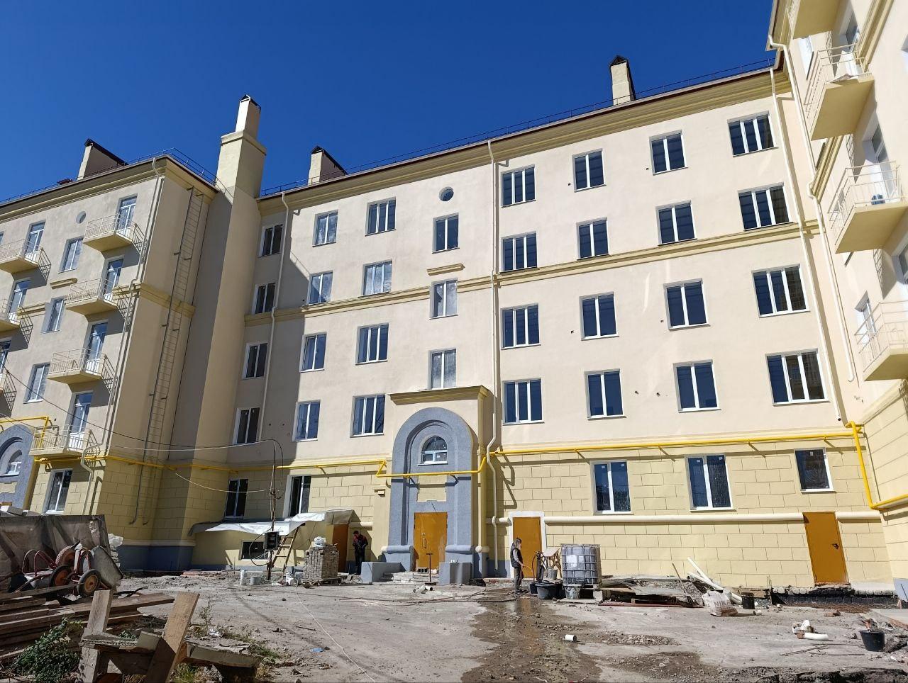 Строители осуществляют восстановление конструктива, кровли, фасада, окон и дверей здания, входных групп, отделки и электрики МОП. Также ведется восстановление инженерных сетей: систем центрального отопления, газоснабжения, водоснабжения и водоотведения. В данный момент готовность объекта составляет 85%.