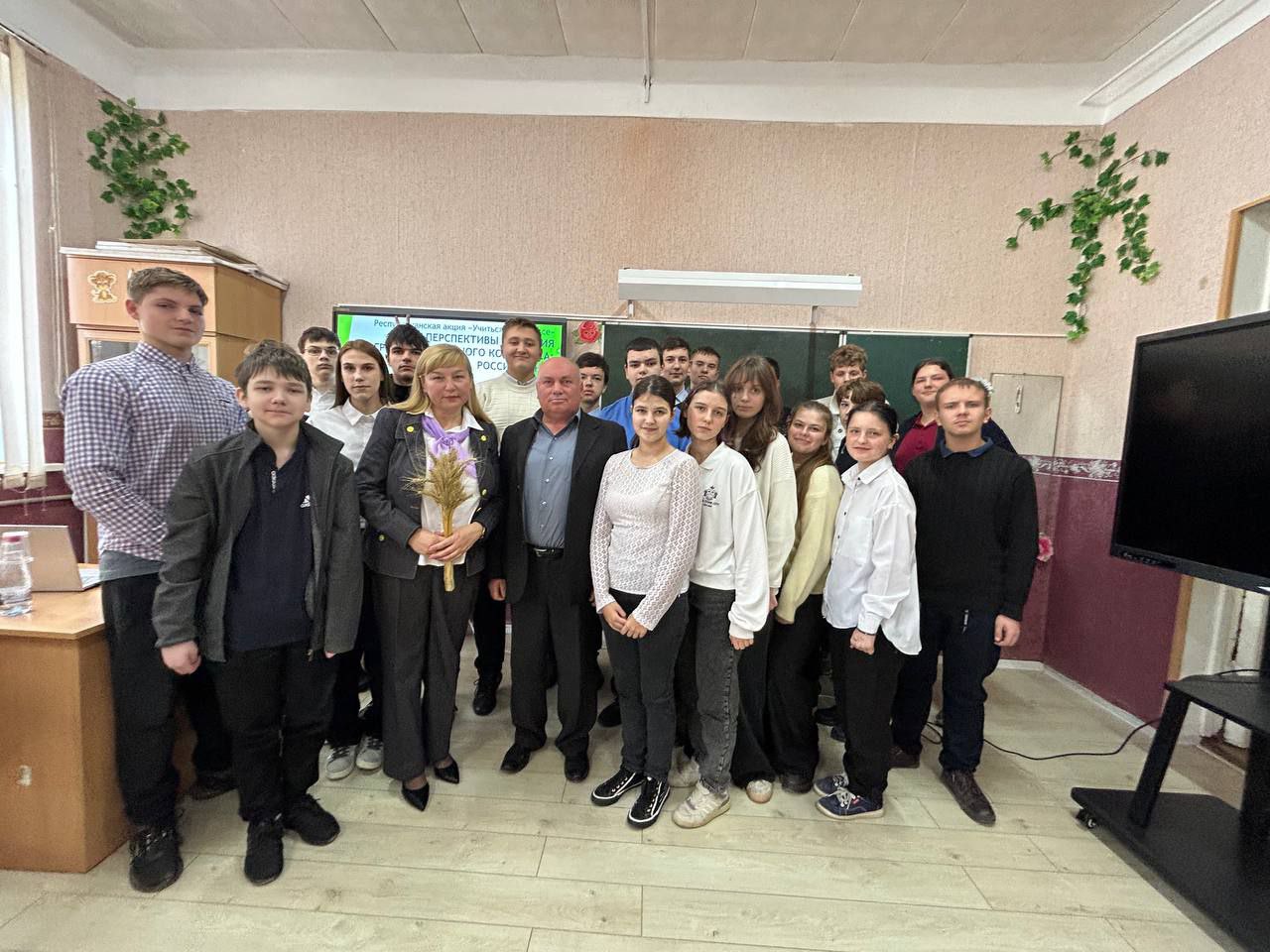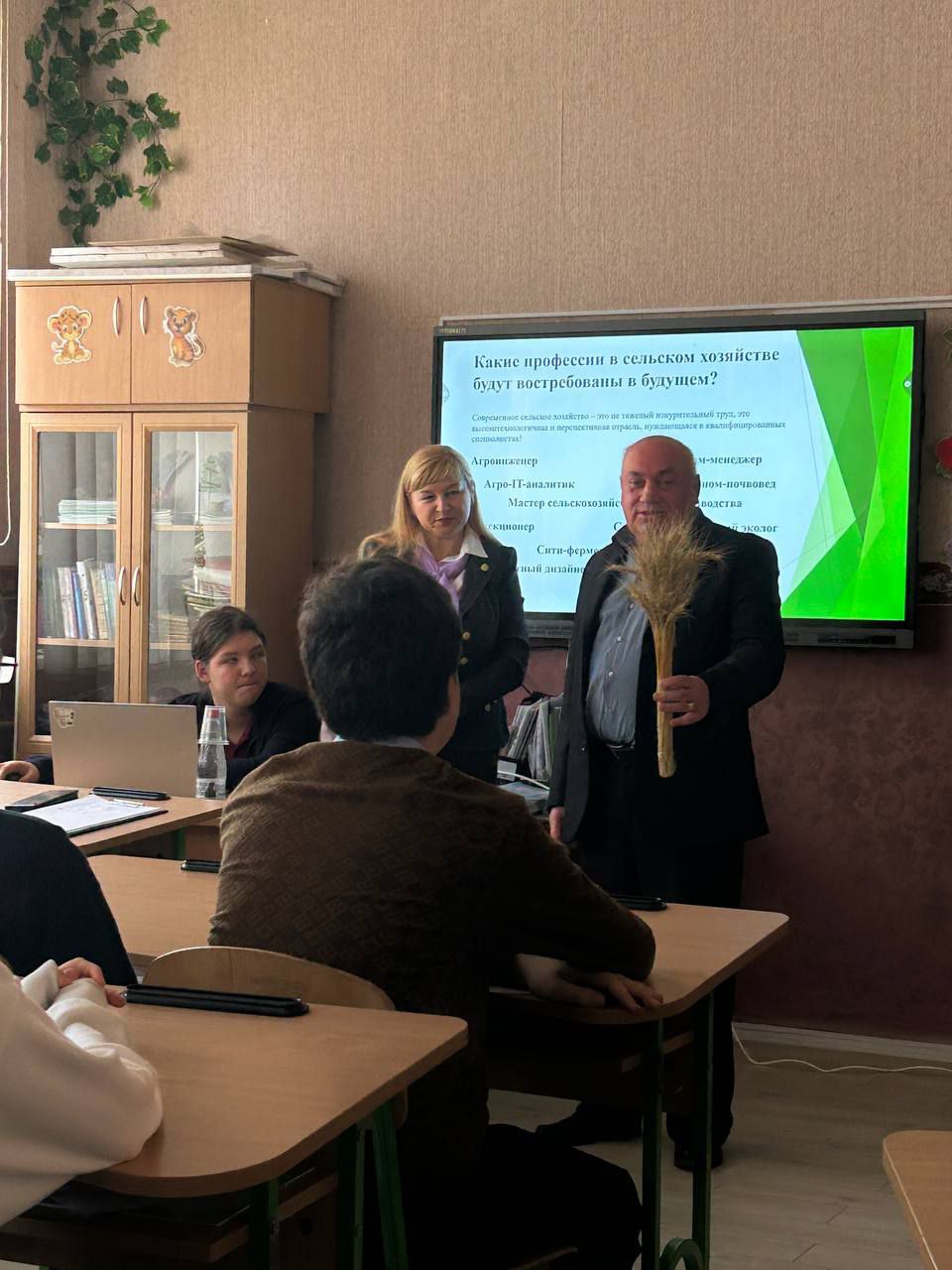 Учащиеся старших классов, преподаватели, заведующий сектором по вопросам сельского хозяйства администрации Ясиноватского муниципального округа Селеменев В. И. обсудили темы развития предприятий агропромышленного комплекса Ясиноватского муниципального округа, перспективные направления развития отрасли, потребность отрасли в кадрах.
