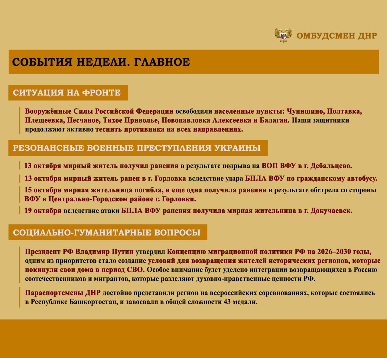 Дарья Морозова: ОБЗОР СОЦИАЛЬНО-ГУМАНИТАРНОЙ СИТУАЦИИ, СЛОЖИВШЕЙСЯ НА ТЕРРИТОРИИ ДОНЕЦКОЙ НАРОДНОЙ РЕСПУБЛИКИ ВСЛЕДСТВИЕ ВОЕННЫХ ДЕЙСТВИЙ В ПЕРИОД С 13 ПО 19 ОКТЯБРЯ 2025 г