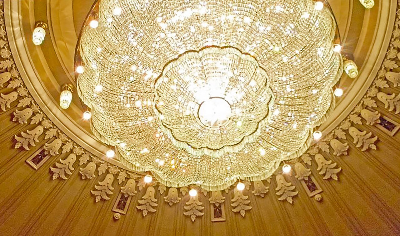 Уникальную люстру диаметром и высотой 3,5 метра изготовили на стекольном заводе в Константиновке. Все детали ручной работы, каждый ее хрустальный элемент соединен между собой скобами.
