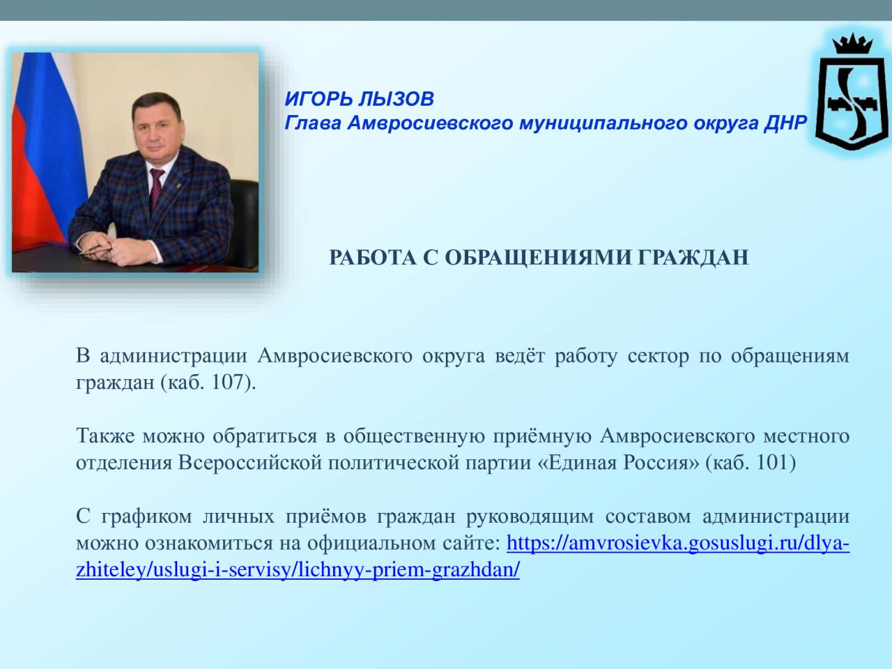 Глава Амвросиевского муниципального округа Игорь Лызов провел прямую линию с населением. Основные тезисы собраны в карточках.