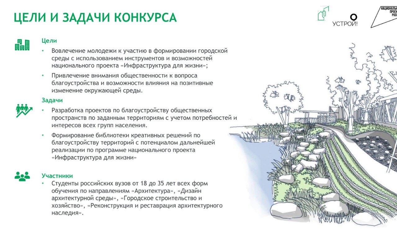 Конкурс проводится при поддержке Минстроя России и направлен на привлечение будущих архитекторов к участию в разработке проектов по формированию комфортной городской среды и созданию библиотеки креативных решений по благоустройству опорных населенных пунктов с целью дальнейшей реализации по программе национального проекта «Инфраструктура для жизни».