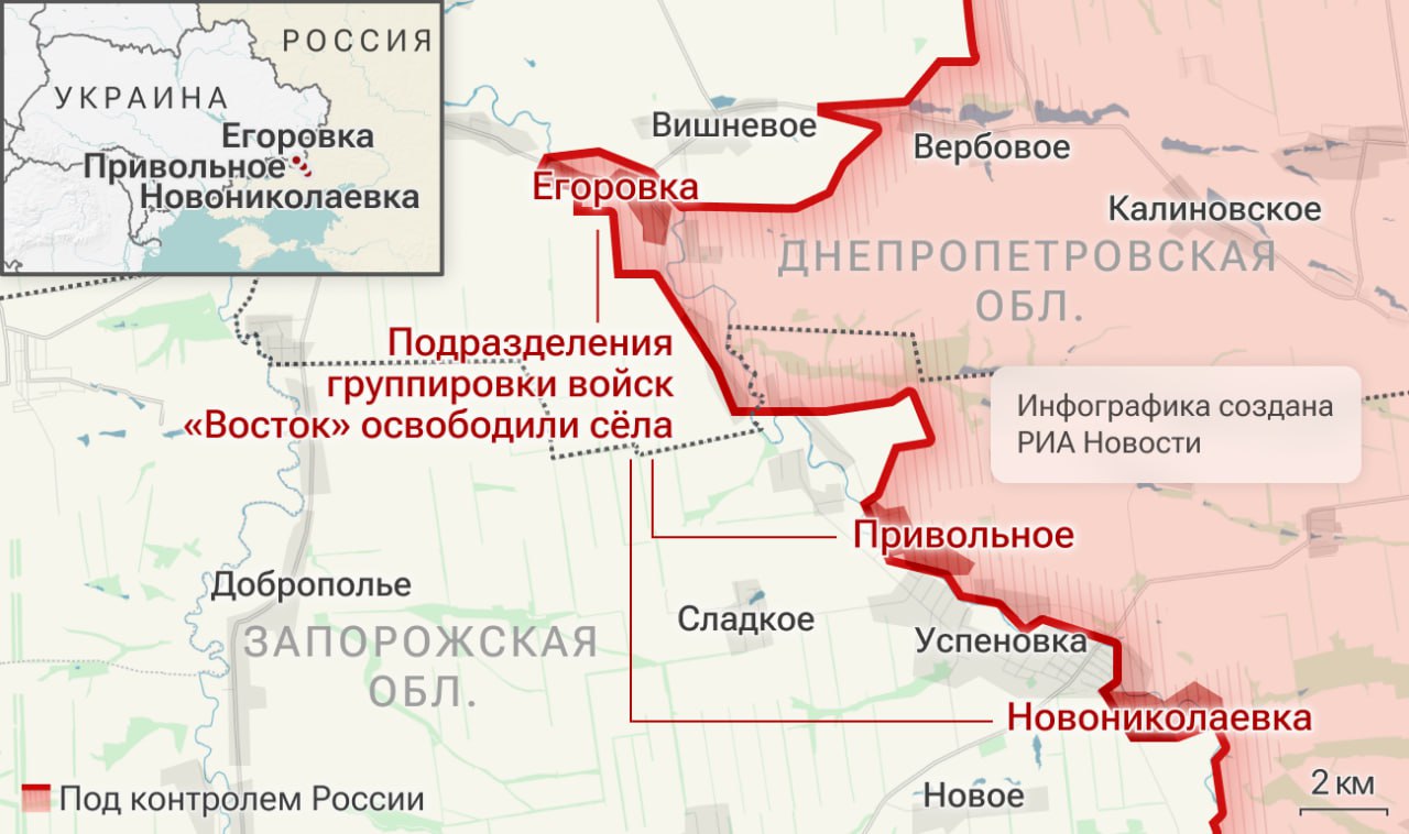 Группировка "Восток" освободила Новониколаевку и Привольноев Запорожской области, Егоровку в Днепропетровской области, сообщается в сводке Минобороны.