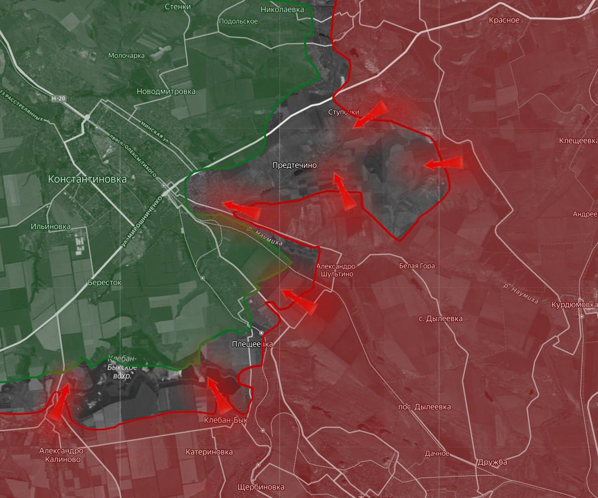 Бои идут и в частном секторе самой Константиновки, куда ранее смогли просочиться малые пехотные группы ВС РФ. Отдельные из них подходят к железнодорожной станции, где проходит крупнейший в городе мост через Кривой Торец. К востоку от города российские силы вытеснили ВСУ из большей части Предтечино».