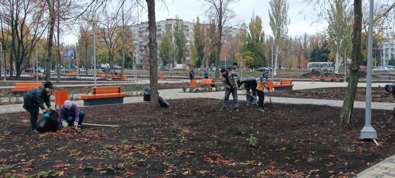 Трудовыми коллективами коммунальных предприятий, сотрудниками Департамента жилищно-коммунального хозяйства Администрации Шахтерского округа, ООО «Специалист» выполняется уборка листвы, сорной растительности с газонов на территории сквера возле памятника Владимиру Ленину.