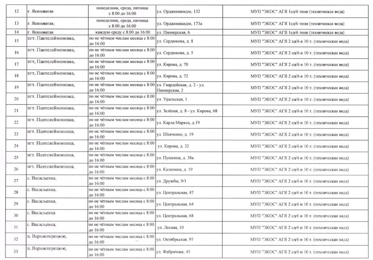 График подвоза технической воды по территории Ясиноватского муниципального округа на ноябрь 2025 года
