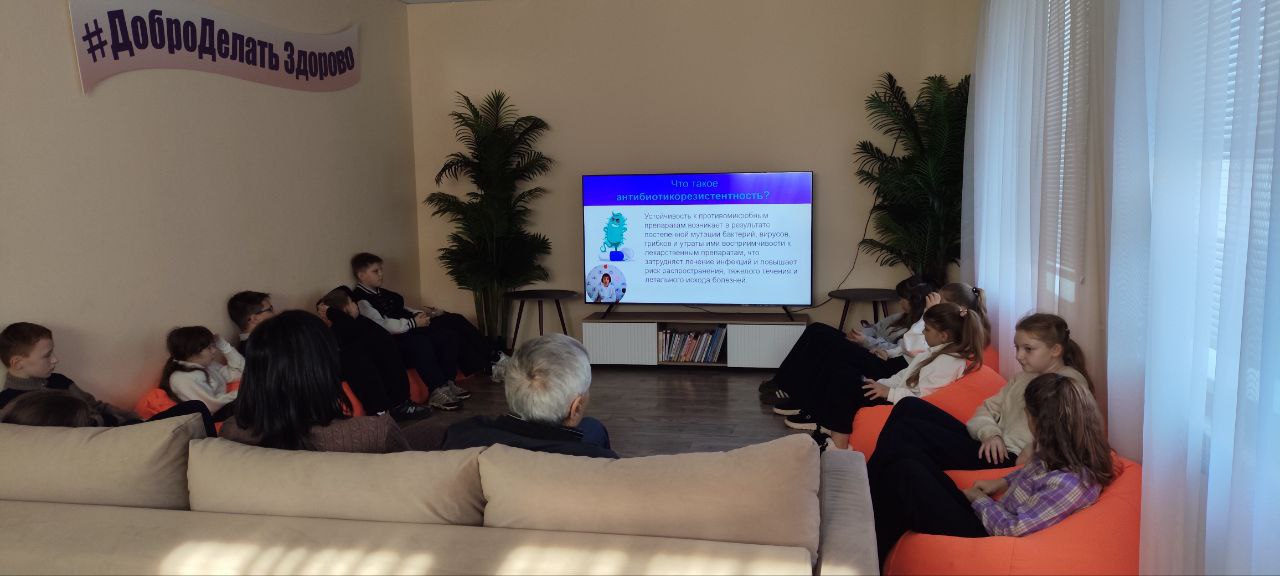 Для школьников был продемонстрирован специально подобранный видеоматериал, который в доступной форме объяснял, что такое антимикробная резистентность, почему она возникает, как влияет на лечение болезней и почему так важно соблюдать правила гигиены и правильно использовать антибиотики. Юные слушатели с большим вниманием следили за изложением материала, осознавая всю серьезность поднимаемой темы.