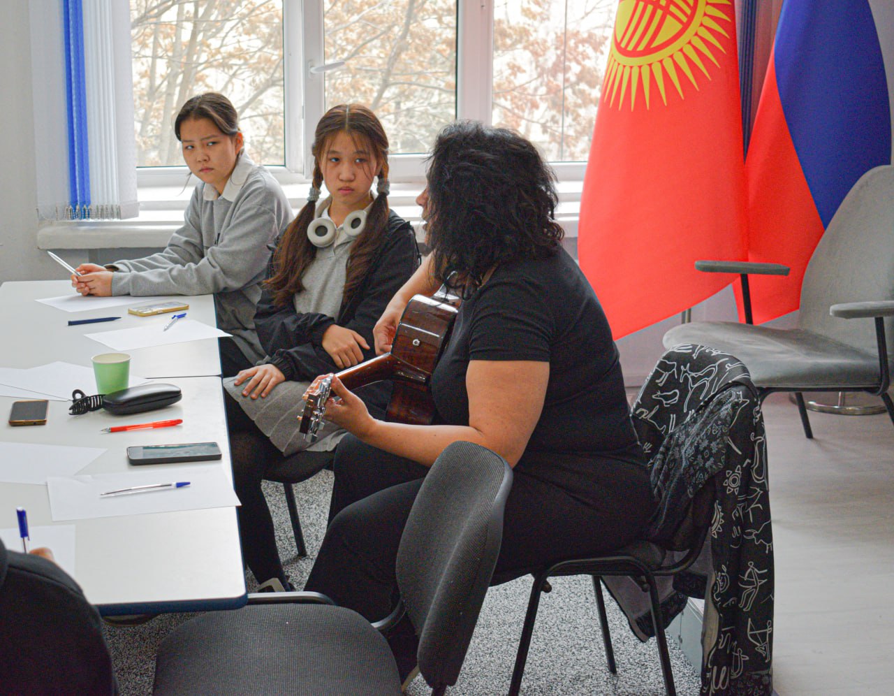 В русском центре Чуйской областной библиотеки (г. Кант) состоялись сразу две встречи с молодежью. Игорь Караулов и Динара Керимова познакомили юнармейцев школы российской авиабазы в Канте с гражданской поэзией. Наталья Нелюбова провела мастер-класс по написанию сказок и песен с учениками школ Канта.