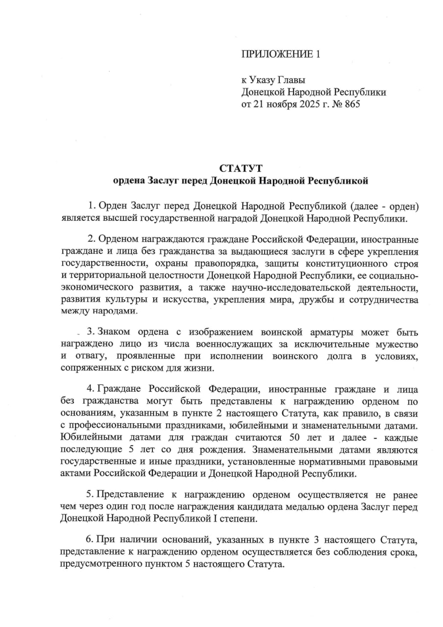Утвержден статут, описание и рисунок ордена Заслуг перед Донецкой Народной Республикой