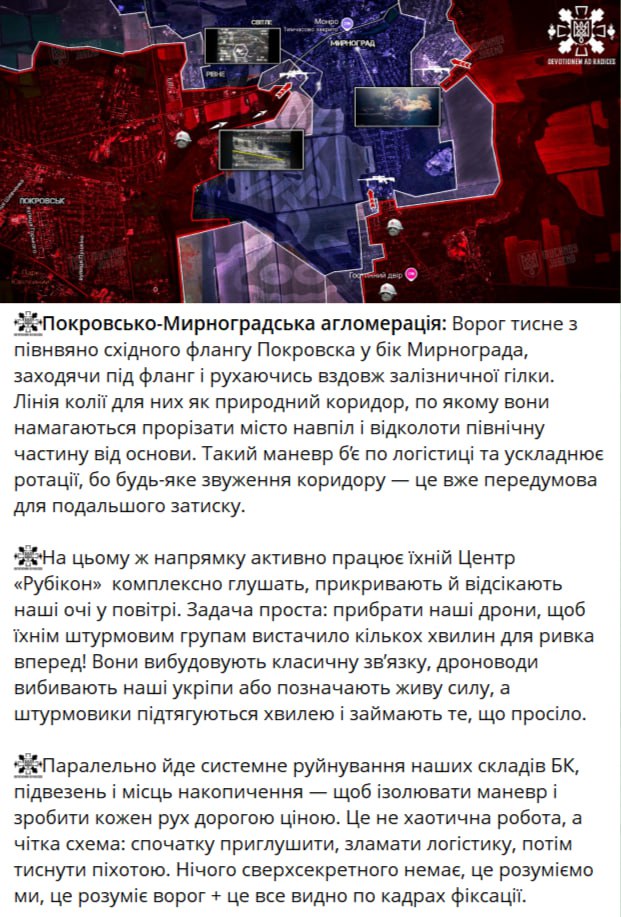 Украинские источники уже не говорят о том, что Покровск потерян, а просто заявляют, что российские войска наступают из Покровска по железной дороге в Мирноград, пытаясь рассечь обороняющуюся группировку ВСУ.