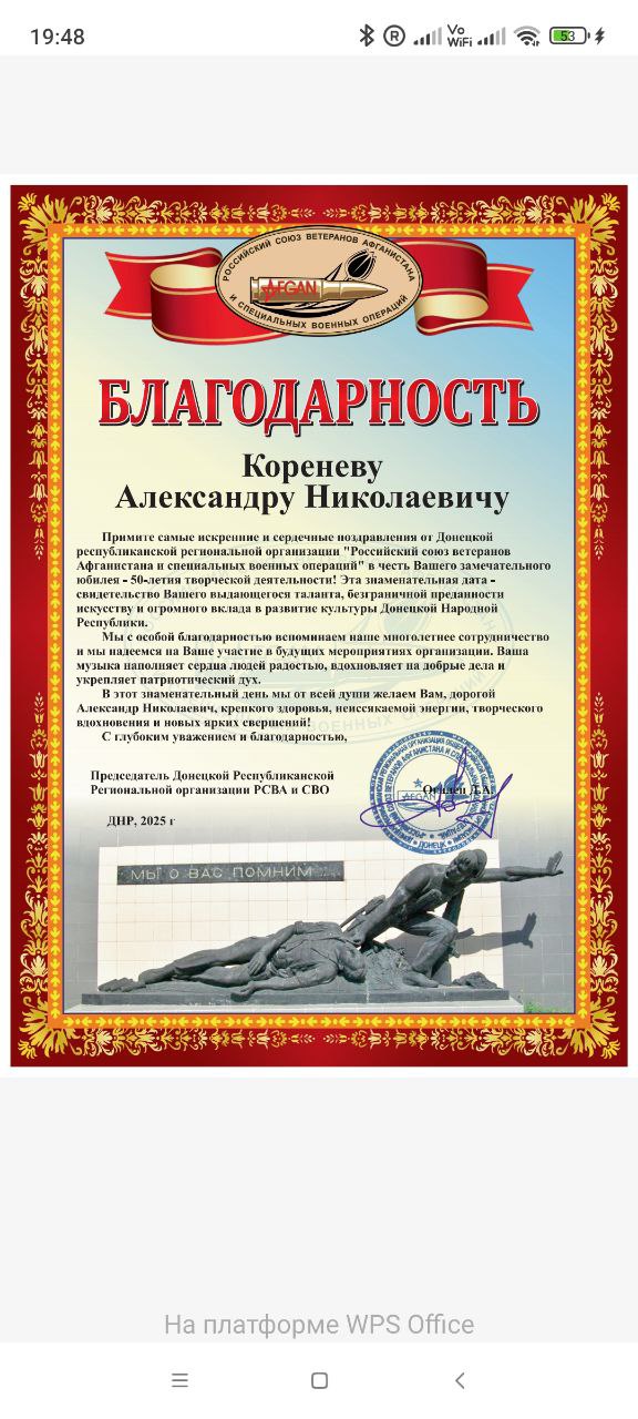 С большим удовольствием принял участие в творческом вечере, посвященному пятидесятилетию творческой деятельности дирижёра, руководителя эстрадно-духового оркестра "Шахтерские зори" Александра Николаевича Коренева.