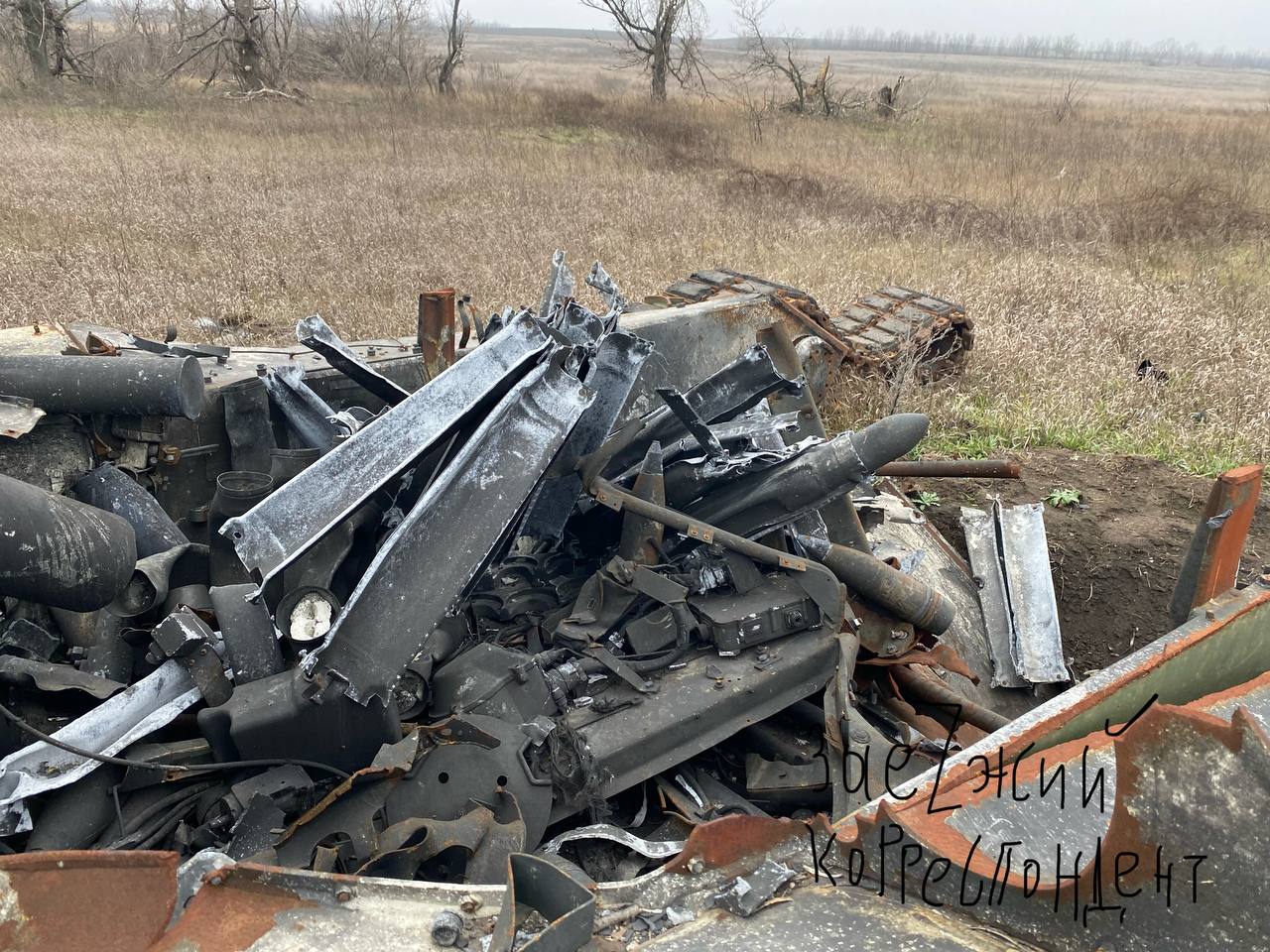 Танк Leopard 1A5 ВСУ, разнесенный на части взрывом боекомплекта в окрестностях Алексеевки (ДНР) на Днепропетровском направлении. Фото (с) @korrzakadrom