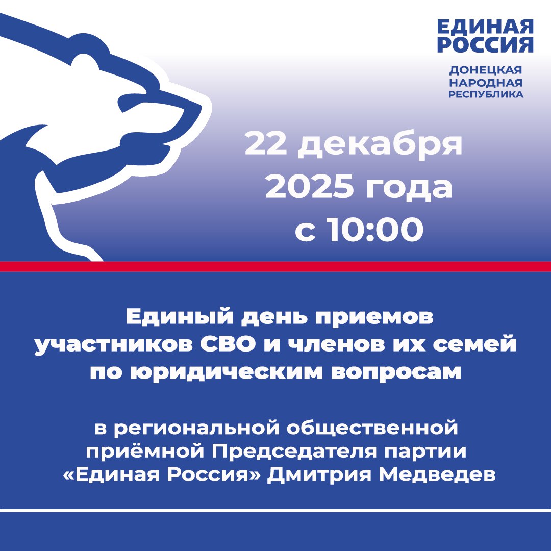 22 декабря с 10:00 в Региональной общественной приёмной Председателя партии «Единая Россия» Дмитрия Медведева по адресу: г. Донецк, ул. Артема, 97 пройдет Единый день приемов участников СВО и членов их семей по юридическим вопросам.