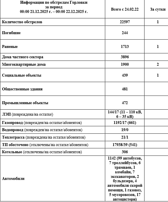 Информация по обстрелам Горловки с 00:00 21.12.2025 г. по 00:00 22.12.2025 г.@Prikhodko1970