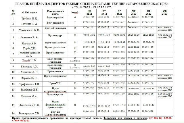 График приема пациентов узкими специалистами ГБУ ДНР "Старобешевская ЦРБ"