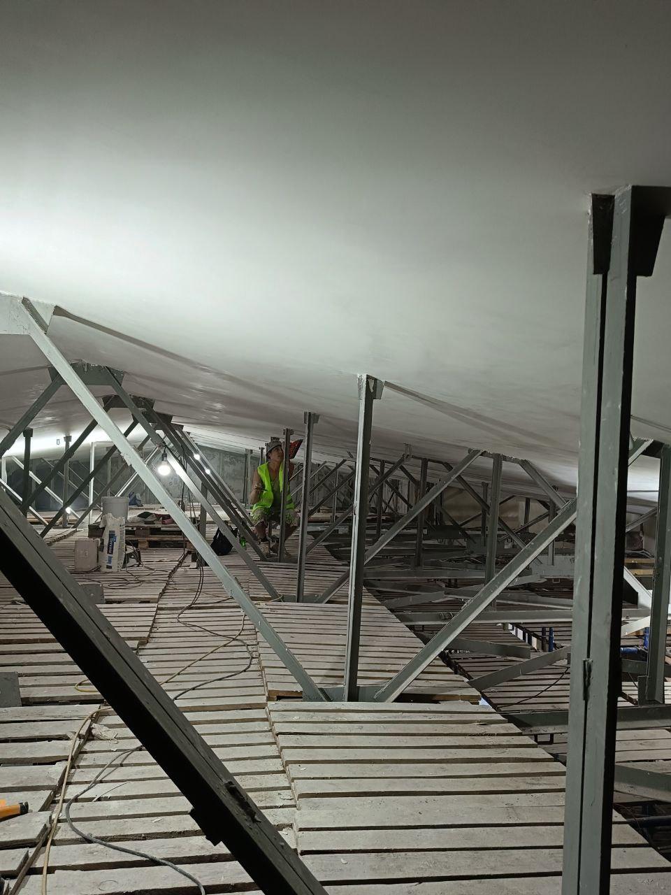 Рабочие оштукатуривают и шпаклюют стены, а также завершают монтаж подвесных потолков и устройство декоративных коробов.