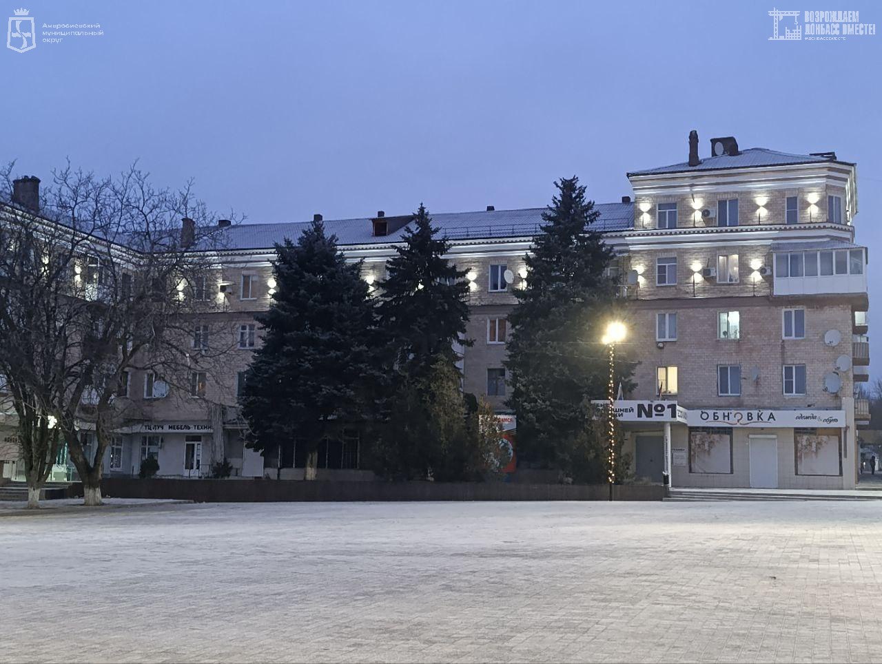 Отремонтированные силами региона-шефа Амурской области дома в центре города Амвросиевка украсила подсветка