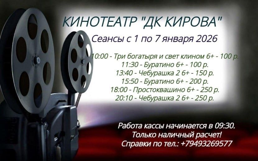 Дорогие друзья! Коллектив кинотеатра "ДК КИРОВА" от всей души поздравляет вас с наступившим 2026 годом! Спасибо вам большое, что провели этот праздничный день с нами. Для нас очень важно, что вы разделили с нами магию большого экрана. Мы искренне надеемся, что все фильмы подарили вам незабываемые эмоции, а наш кинотеатр — уют и комфорт. С нетерпением ждем вашего следующего визита и напоминаем, что наш кинотеатр работает ежедневно все выходные праздничные дни с 1 по 11 января 2026. Расписание с 8 по 11 января будет опубликовано позже. Следите за нашими новостями
