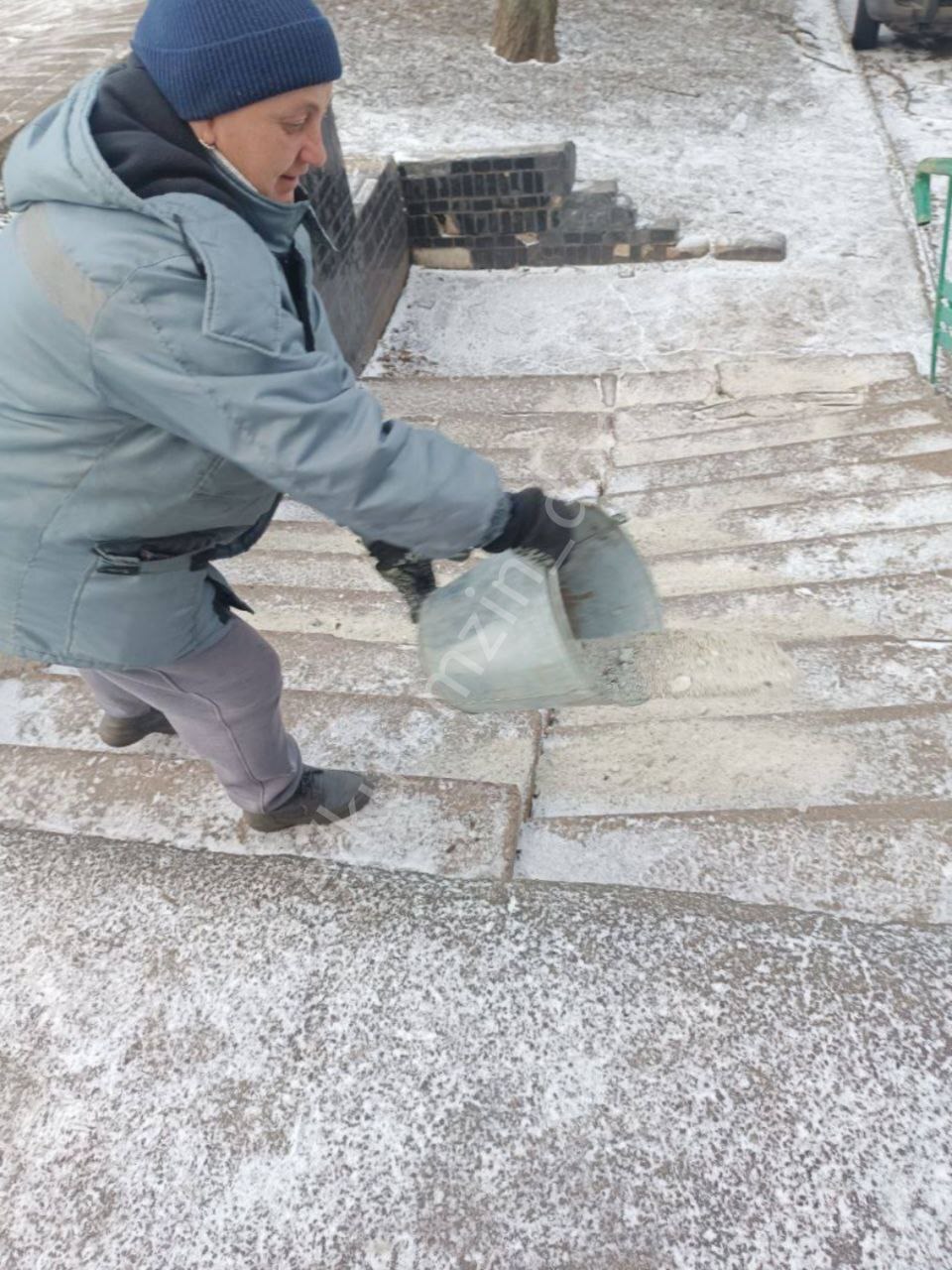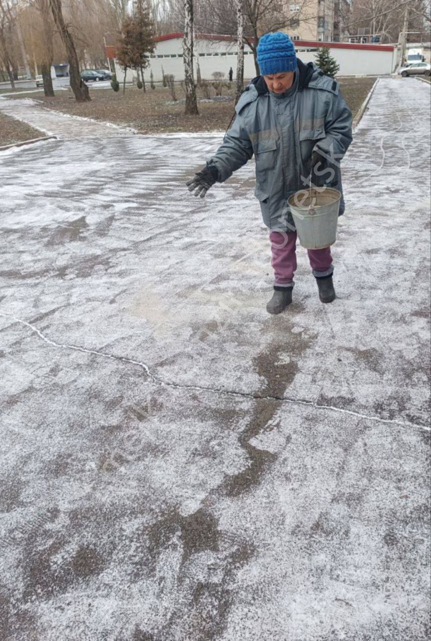 Сегодня специалисты коммунального предприятия «Зелёное строительство» обрабатывали тротуары и пешеходные зоны абразивным материалом.