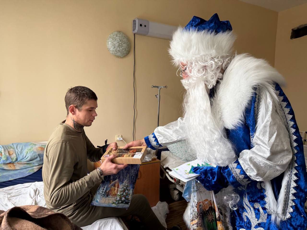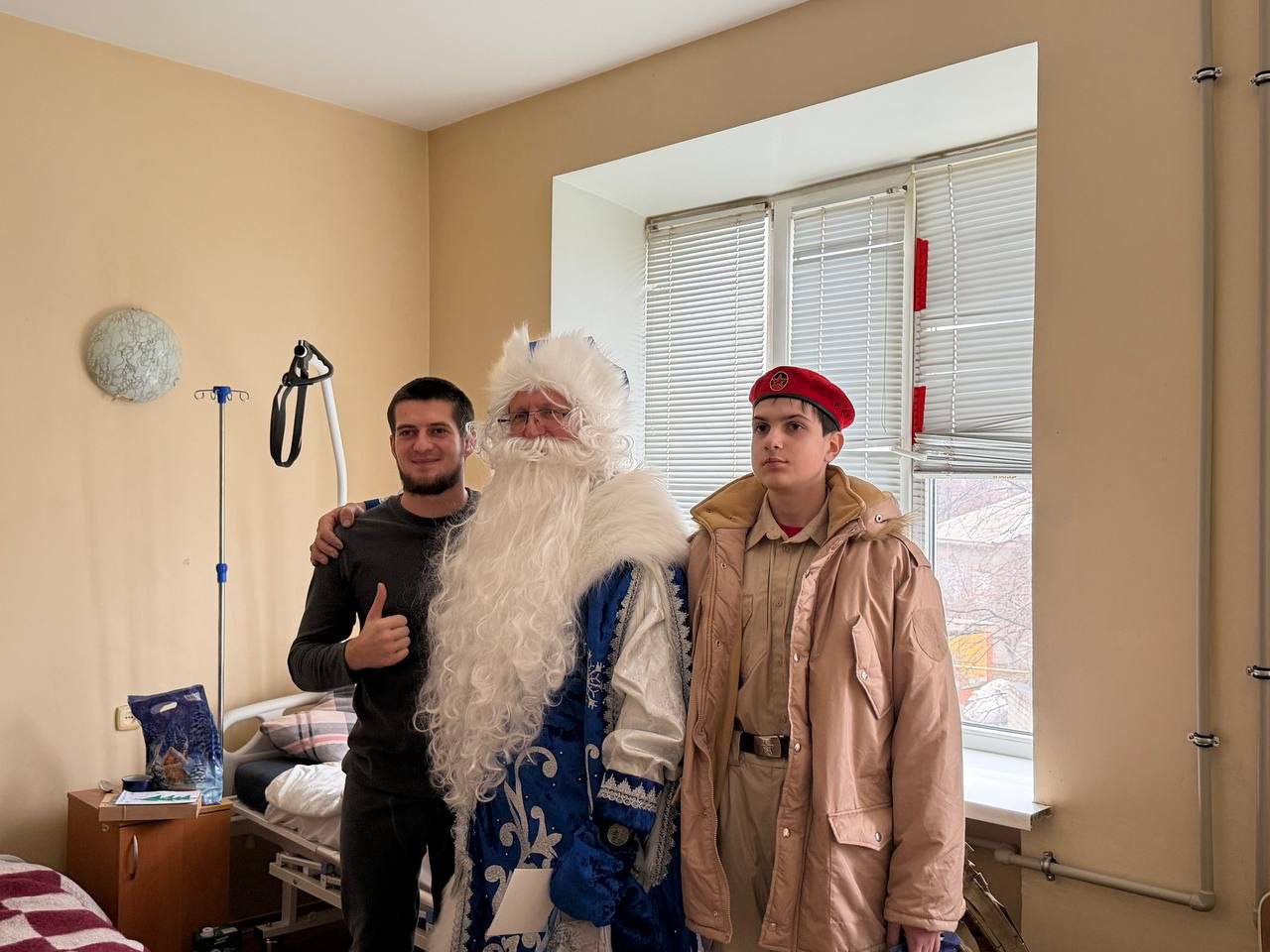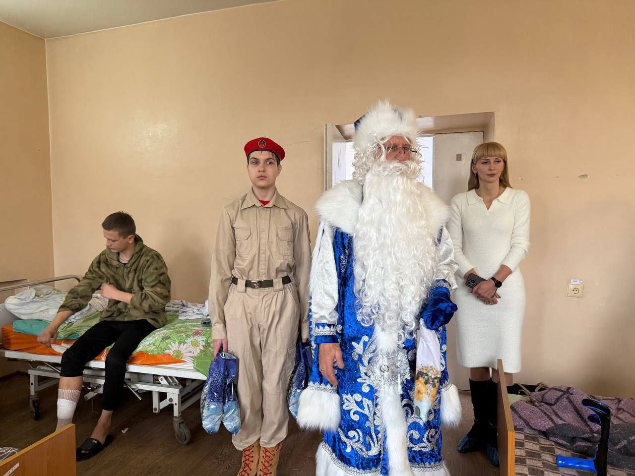 Владимир Финогенов из группы "Наши дети" в роли Деда Мороза и первый заместитель главы администрации с сотрудниками Отдела по делам молодёжи и спорта и активистами юнармейского отряда ГБОУ «Школа № 3 Ясиноватского муниципального округа» и Молодёжки Народного фронта посетили госпиталь, где проходят лечение раненые военнослужащие.