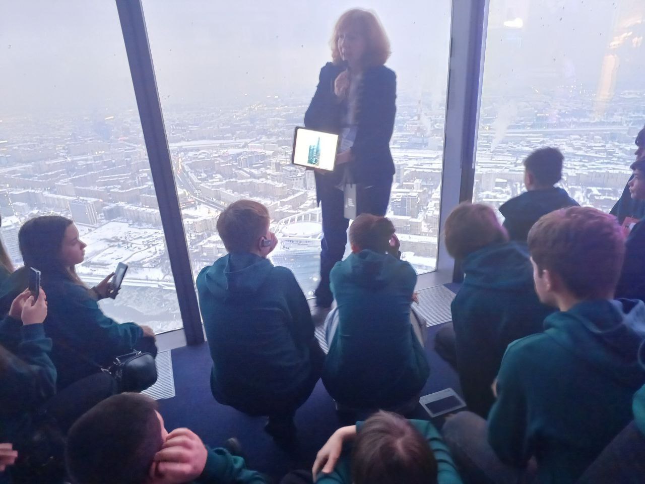 Затем группа отправилась в деловой центр «Москва-Сити», где в комплексе «Федерация» ребята поднялись в башню «Восток». Школьники побывали на смотровой площадке «Панорама 360» на 89-м этаже, совершили экскурсию по небоскрёбу и посетили самую высокую в городе фабрику мороженого.