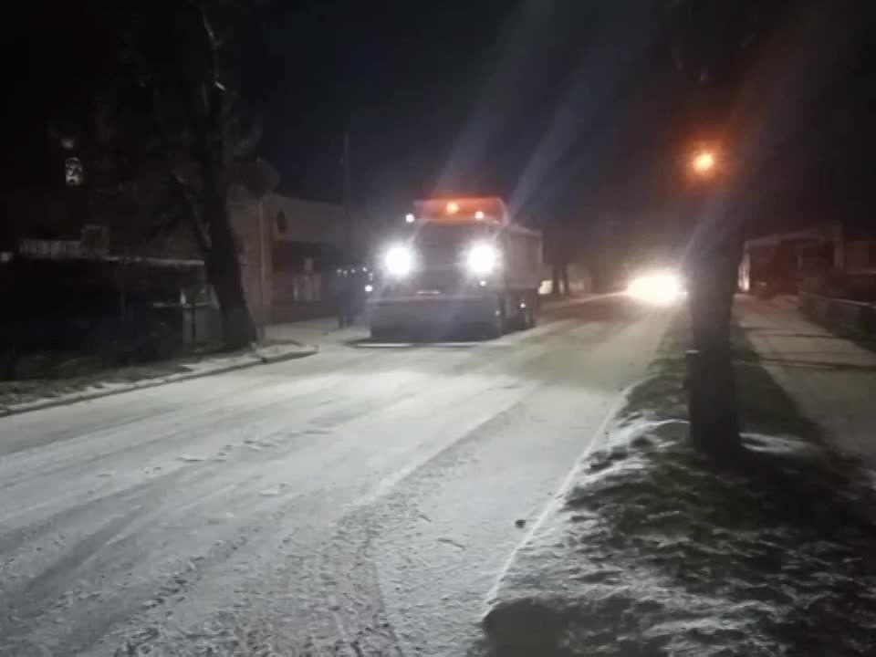 Мангуш: снег, ведётся противогололедная обработка, в дежурстве 4 КДМ и погрузчик.