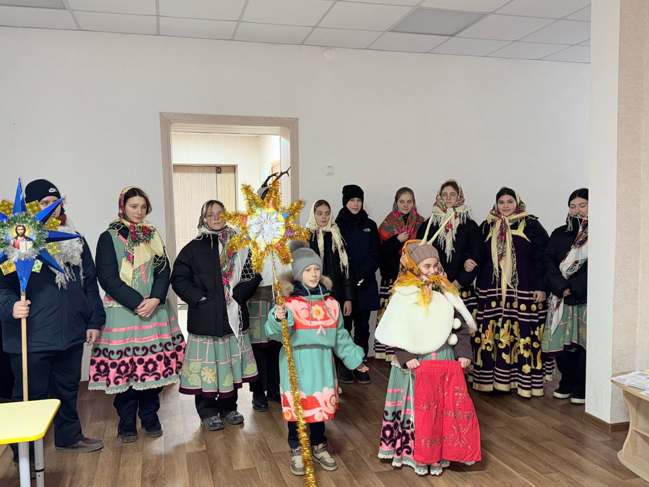 Колядовщики посетили не только жителей округа, но и заглянули в социальные учреждения, представляя народные песни, обряды и поздравления.