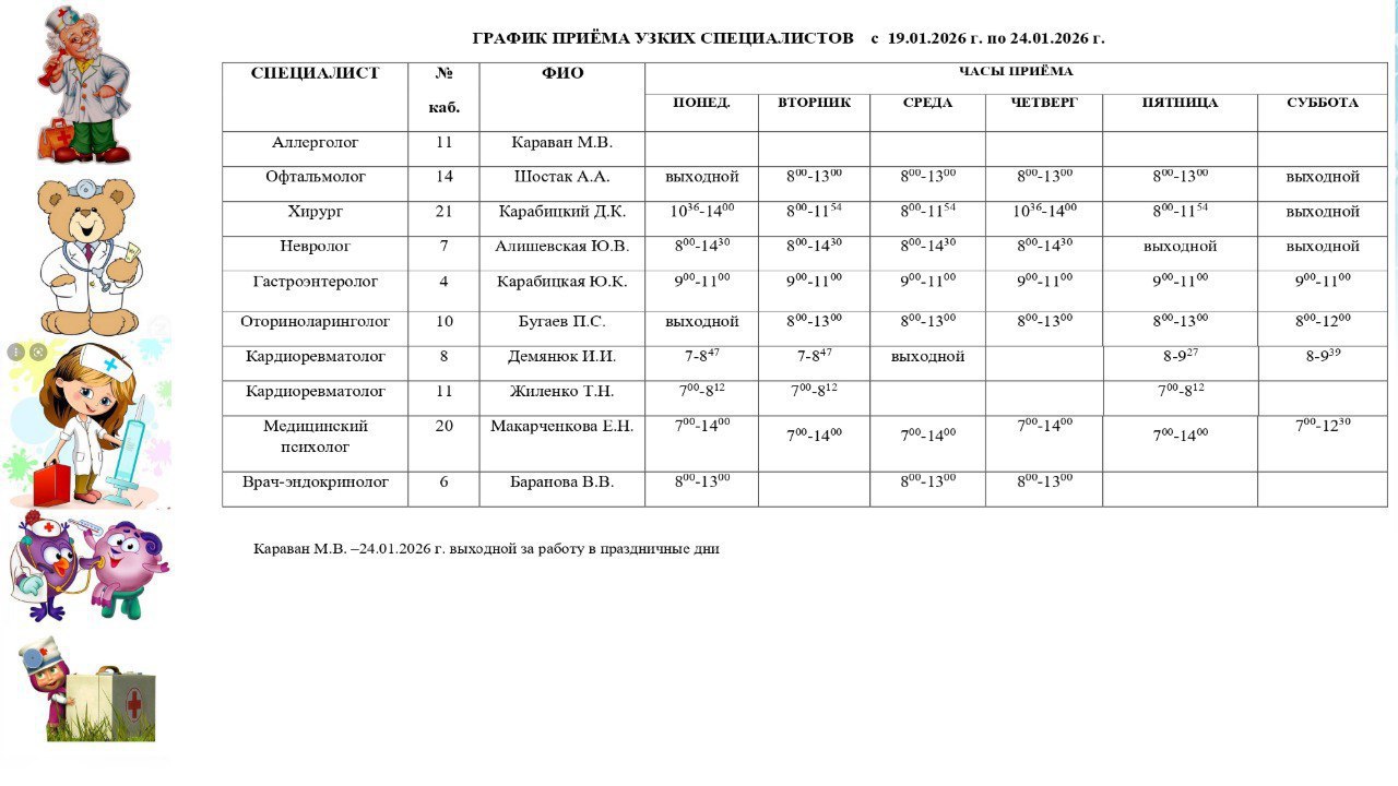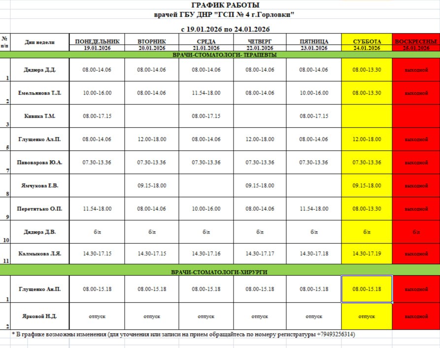 График работы специалистов ГБУ ДНР «ГДСП г.Горловки», ГБУ ДНР «Городской наркологический диспансер г. Горловки», ГБУ ДНР «ГПБ г. Горловки», ГБУ ДНР «ГПТД г.Горловки», ГБУ ДНР «ГДВД г.Горловки», ГБУ ДНР «ГСП г.Горловки», ГБУ ДНР «ГОД г. Горловки», ГБУ ДНР «ГСП № 4 г.Горловки», ГБУ ДНР «ЦОМД г. Горловки»