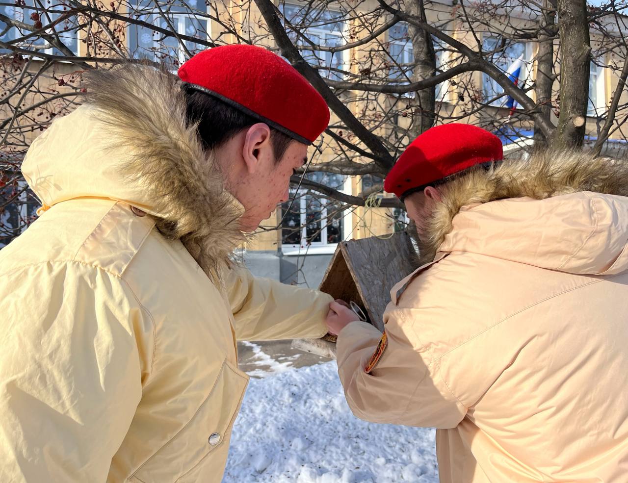 Акция «Покорми птиц и бездомных животных зимой!» Юнармейцы отряда ВПК «Пламя» штаба местного отделения городского округа Харцызска СШ № 4, ученики из 9-А класса Матинян Михаил и Воробьев