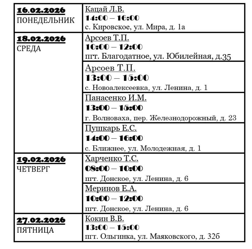 График личного приема граждан депутатами Волновахского муниципального совета Донецкой Народной Республики на ФЕВРАЛЬ 2026 г