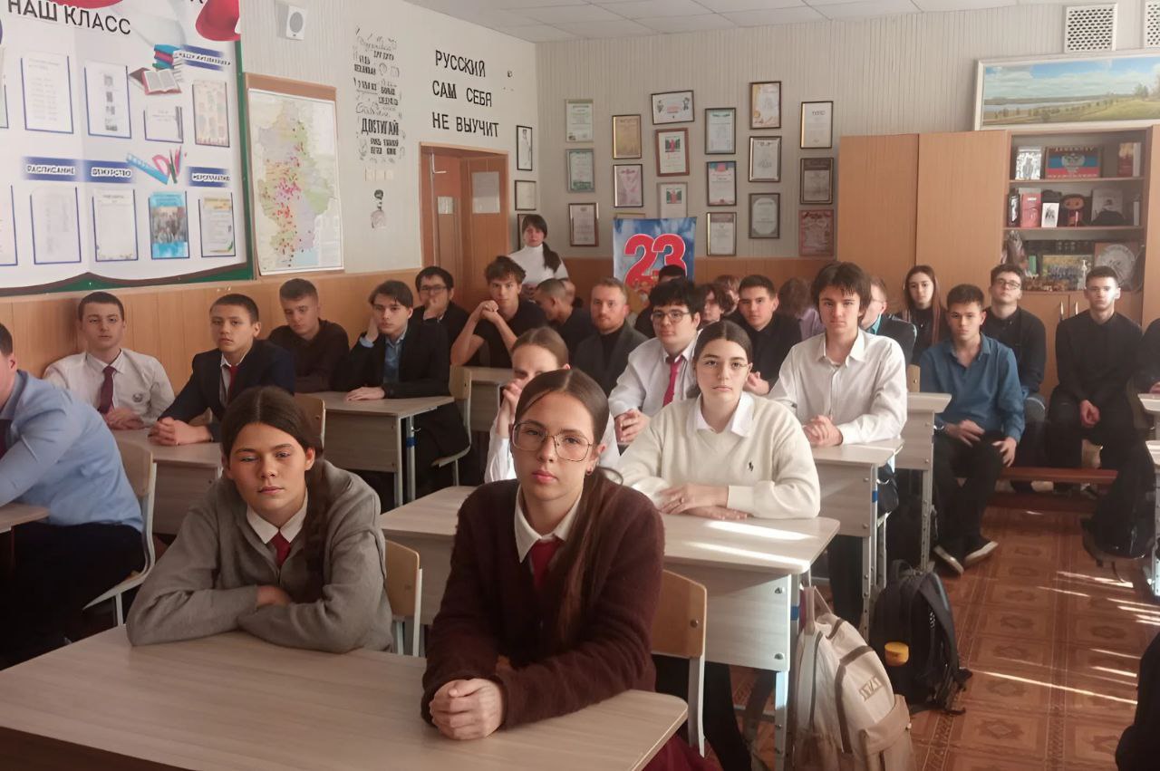 Депутат Народного Совета ДНР Станислав Ретинский и участник боев за аэропорт Владислав Евтушенко провели встречу с учениками макеевской школы № 53 по случаю 11-й годовщины освобождения Донецкого аэропорта.