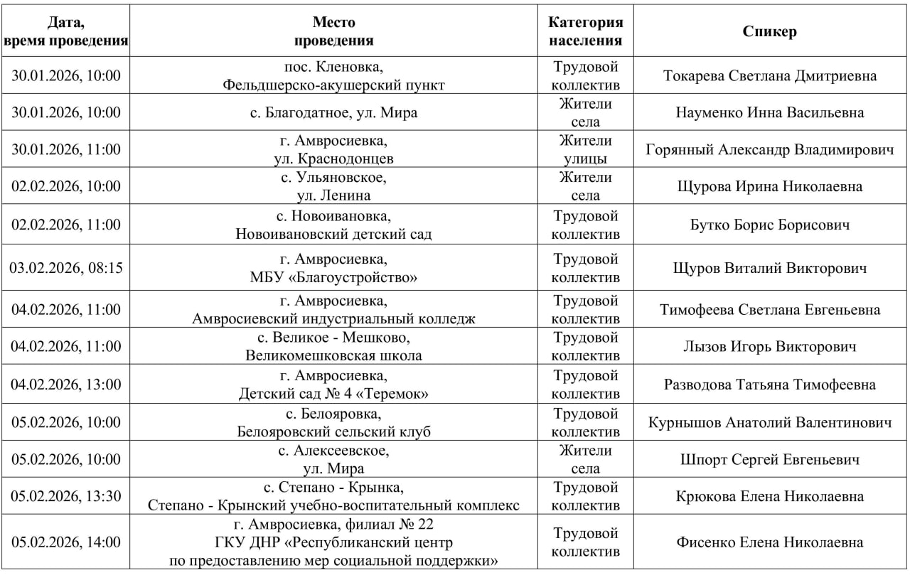 График проведения встреч с населением на подведомственных территориях руководящим составом администрации Амвросиевского муниципального округа, начальниками территориальных отделов администрации округа с 30 января по 5 февраля