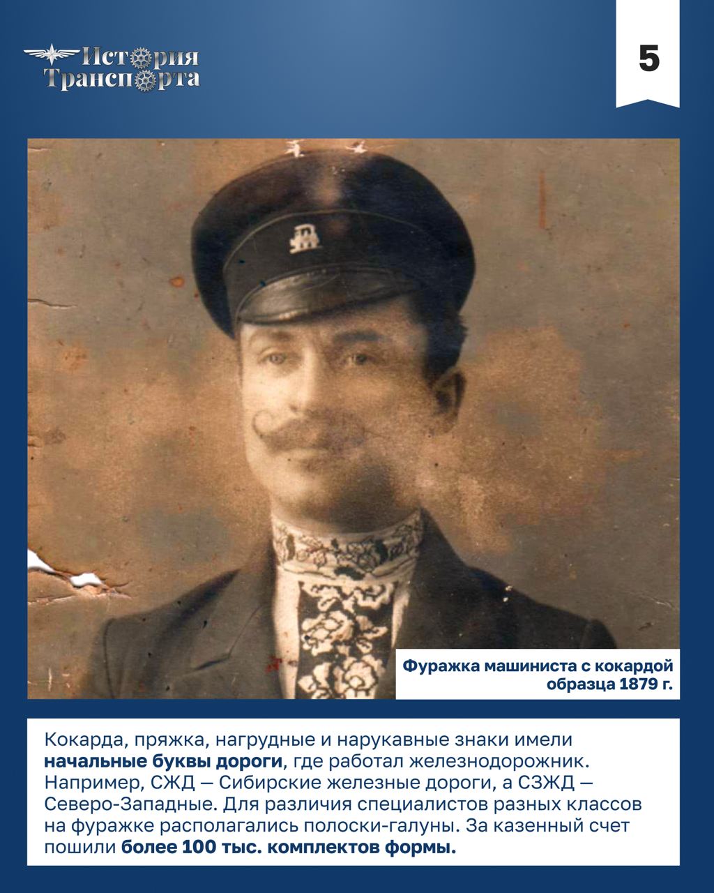 31 января 1879 года приказом Министерства путей сообщения введена специальная форменная одежда для служащих железных дорог. Этому предшествовал указ императора Александра II «Высочайше утвержденное императором описание форменной одежды служащих на Российских (кроме Финляндских) железных дорогах».