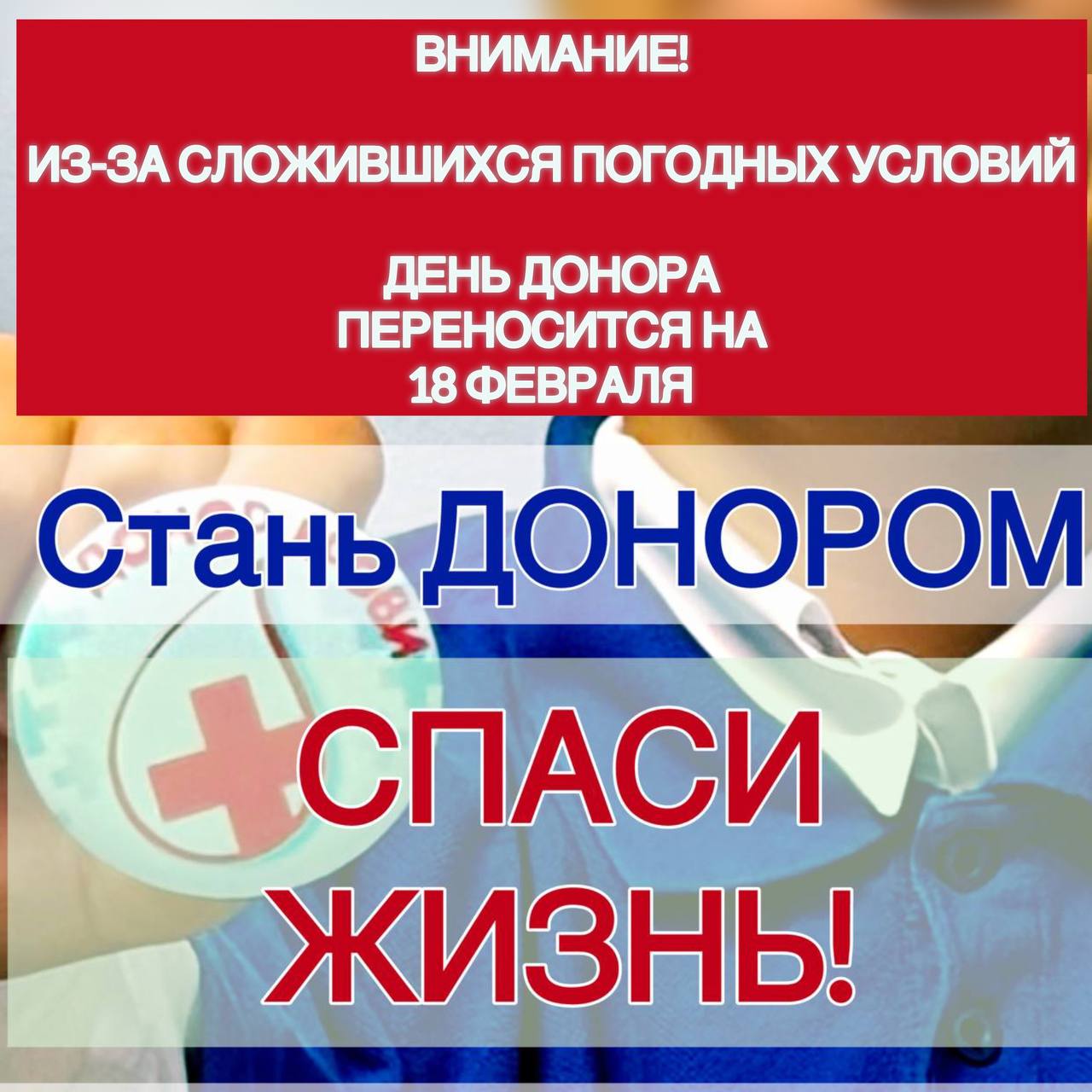 Из-за сложившихся погодных условий, День Донора переносится на 18 февраля