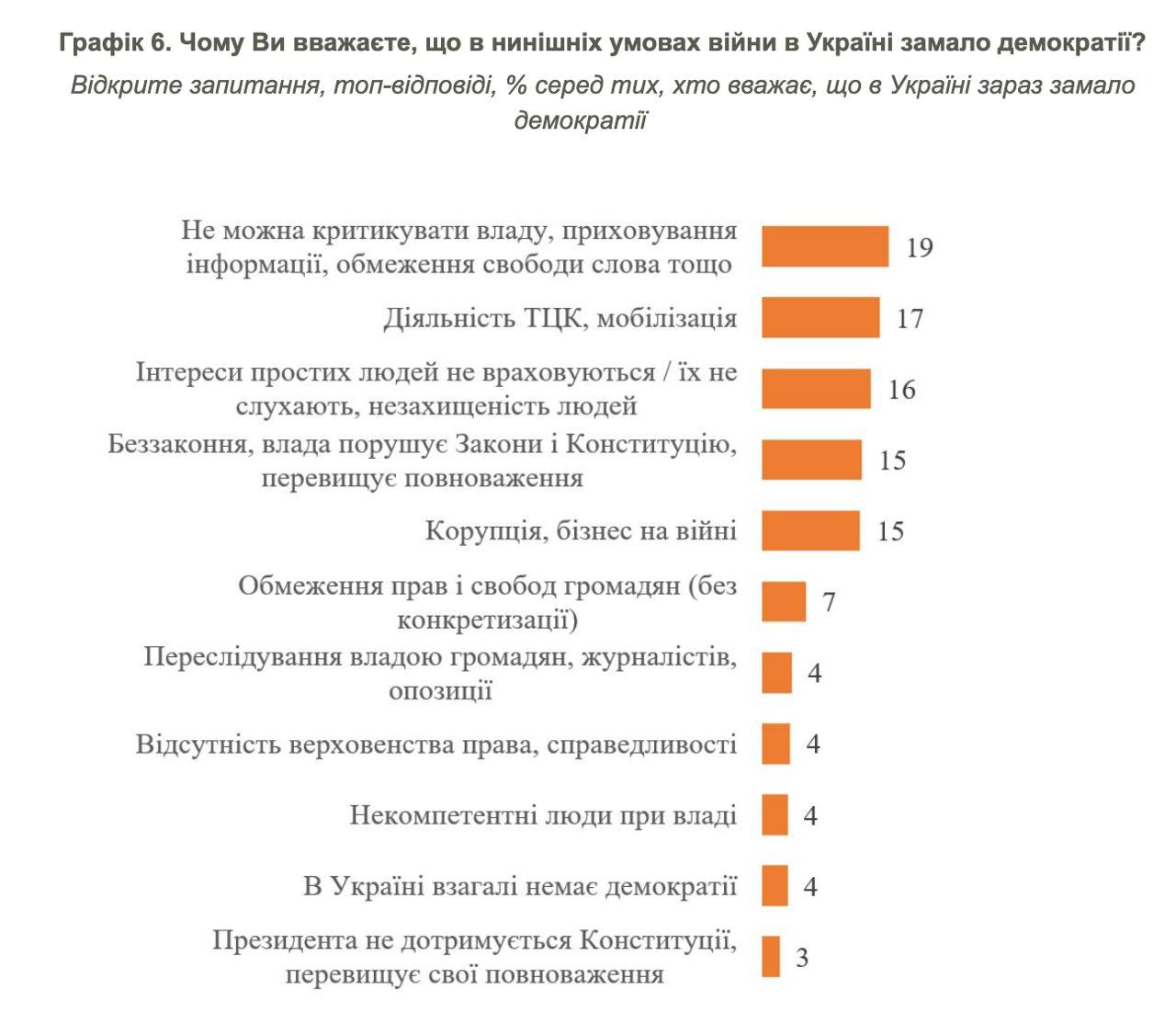 Среди основных признаков нехватки демократии украинцы называют то, что «нельзя критиковать власть, сокрытие информации, ограничение свободы слова» (19%); «деятельность ТЦК, мобилизация» (17%); «интересы простых людей не учитываются / их не слушают, незащищенность людей» (16%); «беззаконие, власть нарушает Законы и Конституцию, превышает полномочия» (15%); «коррупия, бизнес на войне» (15%).
