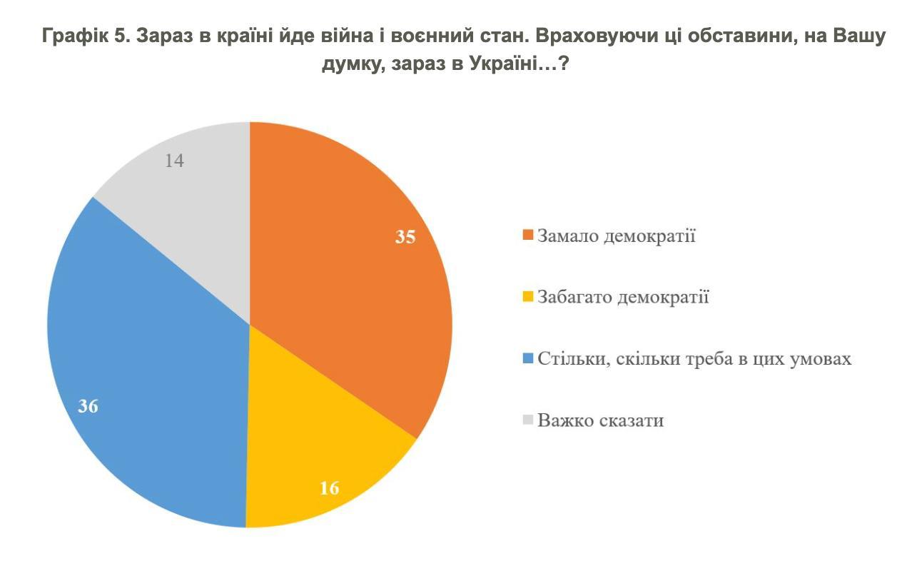 По данным свежего опроса КМИС, 35% опрошенных считают, что Украине не хватает демократии, 36% - что ее столько, сколько нужно в условиях войны, а 16% - что даже многовато. 14% не определились.