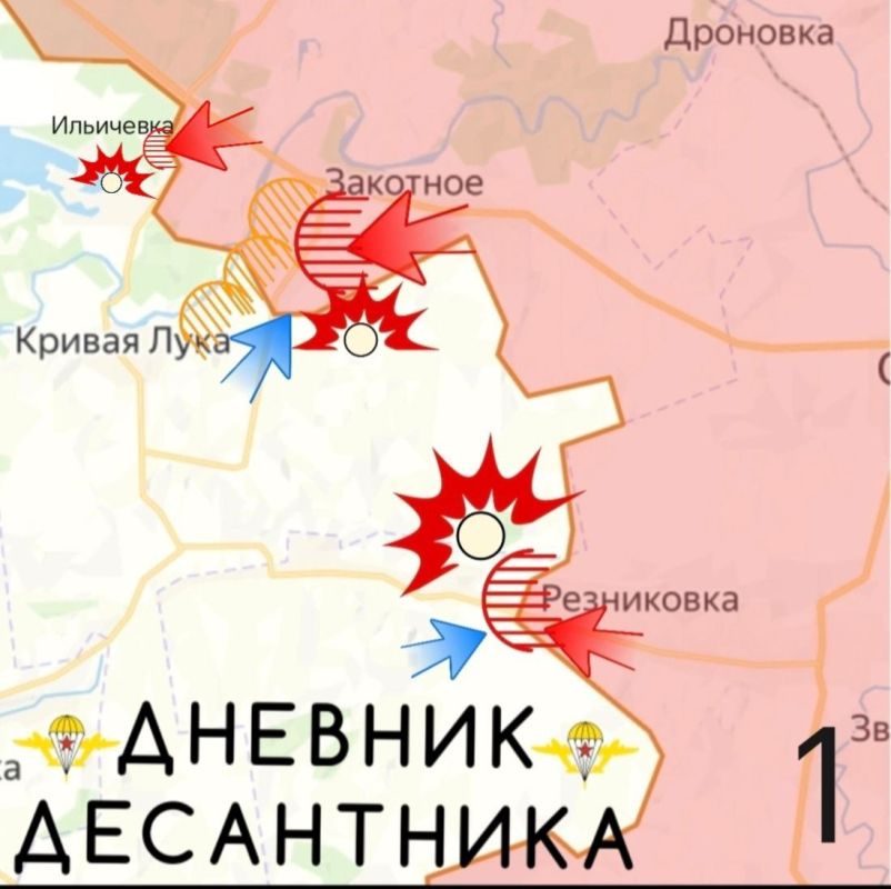 ВС РФ увеличивают контроль территорий, двигаясь по балке юго-западнее Закотного (карта 1). Продолжаем атаковать, выбивая противника из опорных пунктов на склонах, по направлению н.п. Кривая Лука и к господствующим высотам. Продвижение составило около 2 км.;Резниковка. Идут ожесточённые бои. Есть успехи в продвижении в самом селе и на его южных окраинах. Пока противник здесь сохранил контроль на господствующих высотах севернее и южнее Резниковки. На данном участке применяется большое количество БПЛА, что затрудняет продвижение наших подразделений;