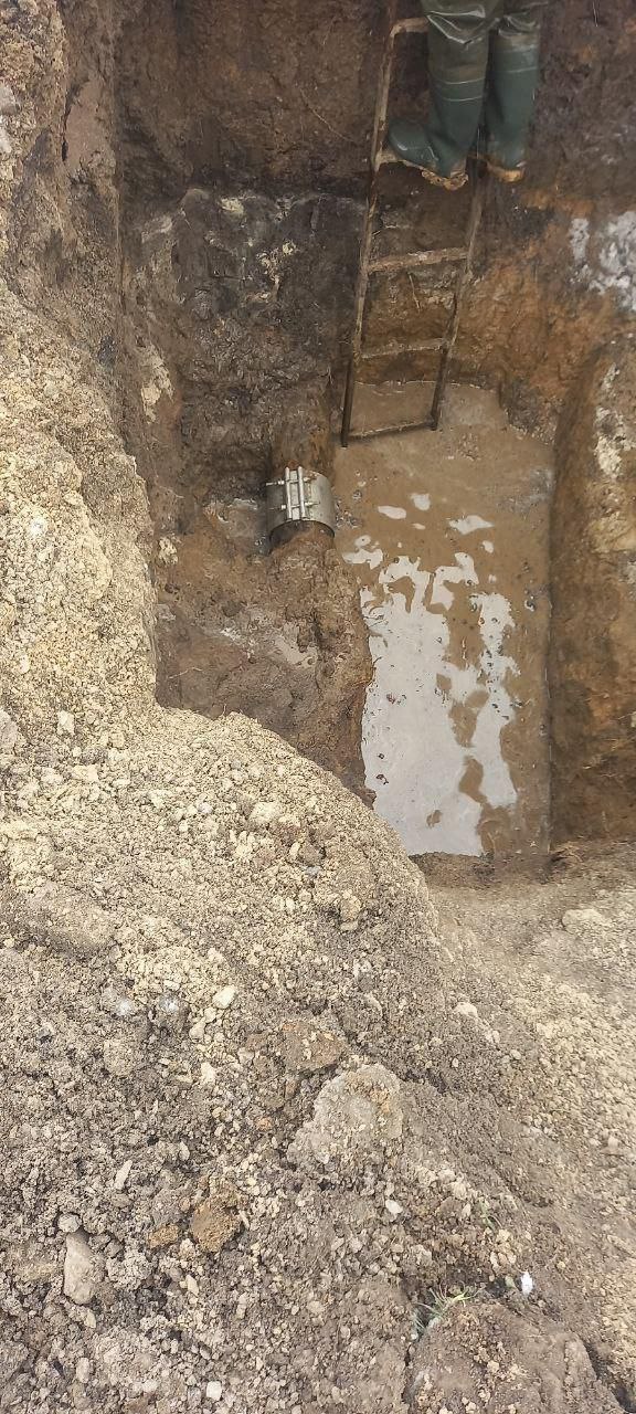В доме на улице Войкова сломалась труба водопроводной линии диаметром 200 мм. Рабочие выполнили земляные работы при поддержке техники, откачали воду и установили ремонтную муфту на поврежденный участок.