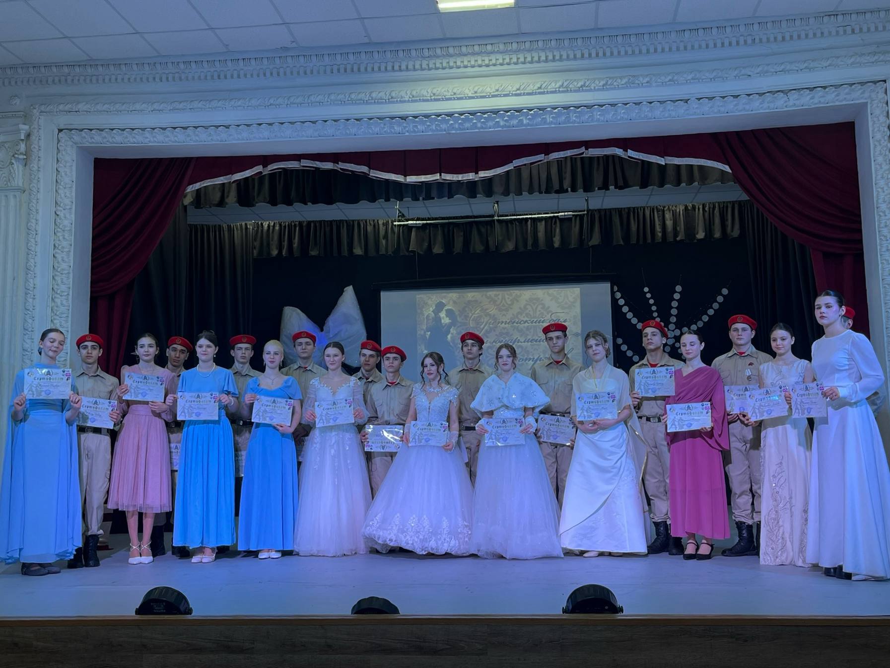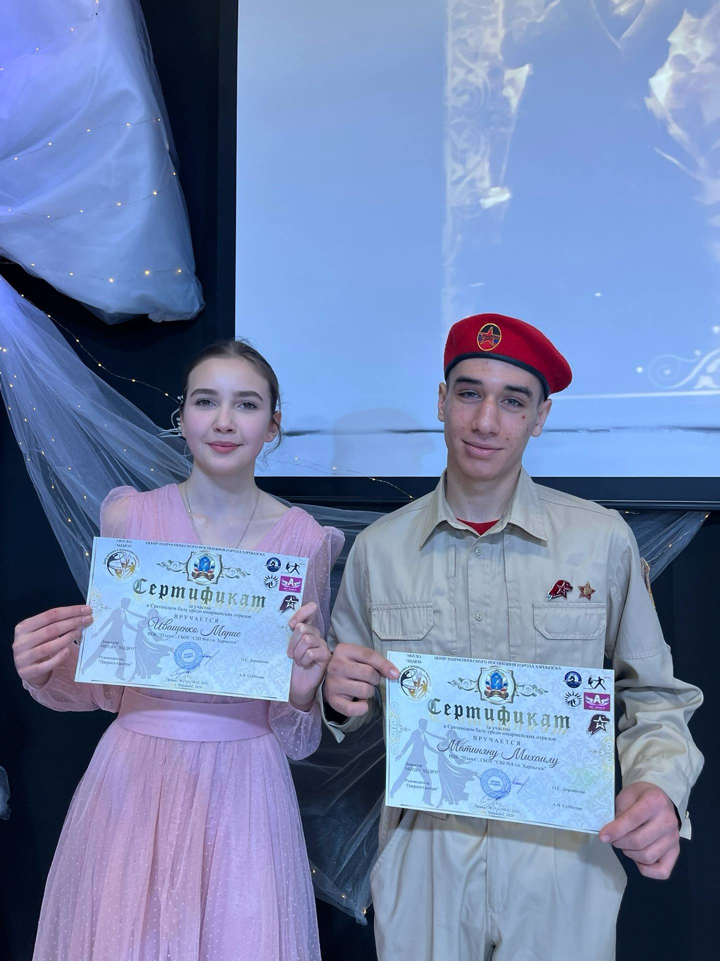 Юнармейцы отряда ВПК «Пламя» штаба местного отделения городского округа Харцызска СШ № 4, ученики из 9-А класса Матинян Михаил и Иващенко Мария приняли участие в «Сретенском балу» посвященному мужеству, доблести и преданности Родине.