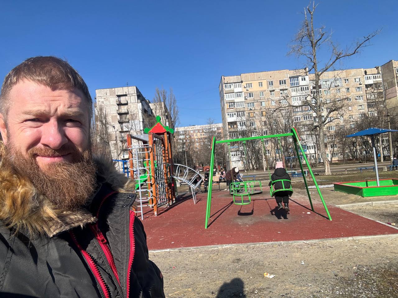 Проезжали мимо детской площадки, которую я открывал здесь в прошлом году. Это был мой личный подарок донецким детям на свой день рождения. Тогда хотелось сделать что-то по-настоящему нужное и живое – не для отчётов, а для ребят, которые растут в непростое время.