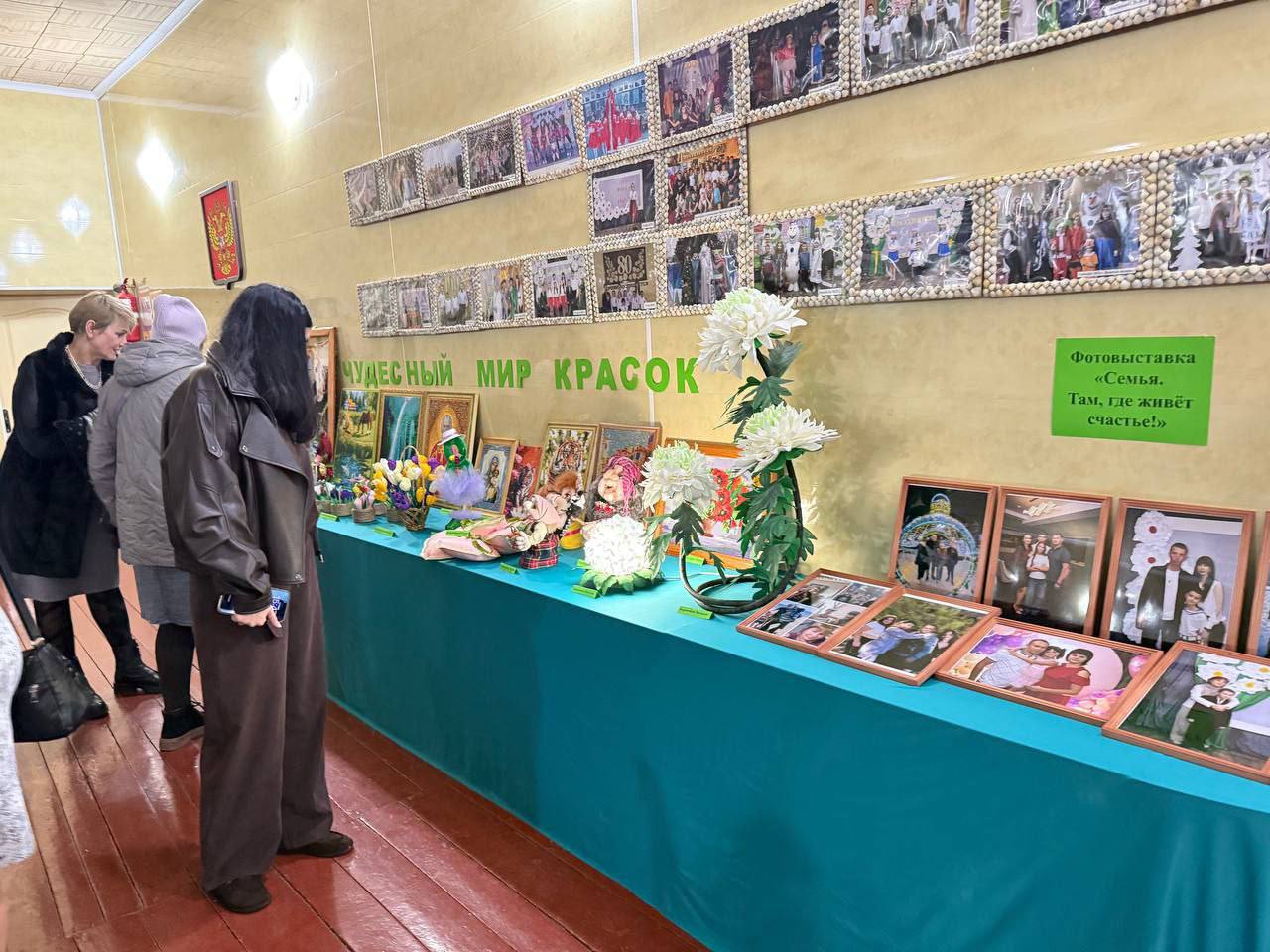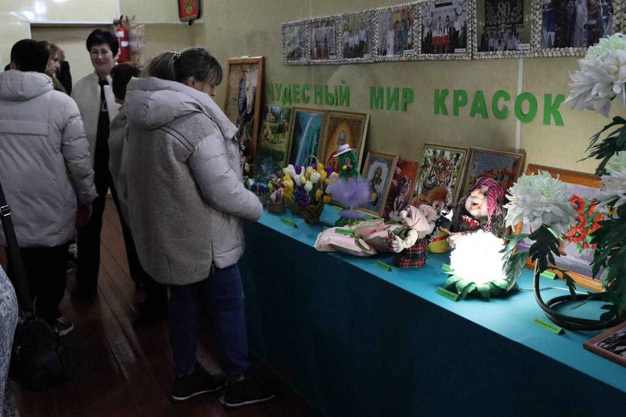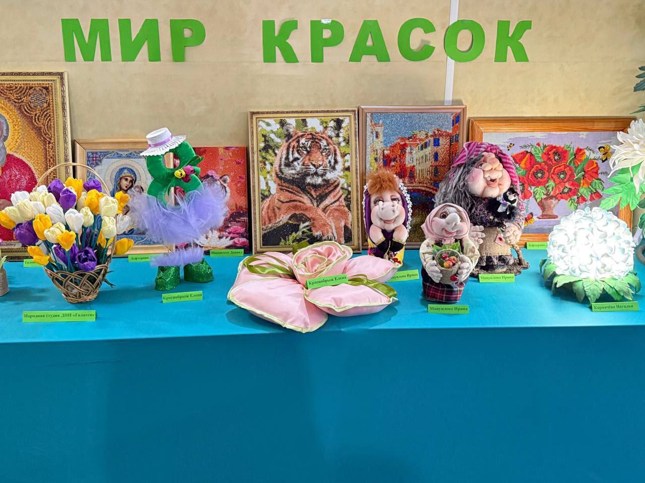 На выставке «Чудесный мир красок» представлены уникальные работы мастериц из фоамирана, в текстильно-капроновой технике, вышивке крестиком, цветочные композиции из гофрированной бумаги, алмазная мозаика.