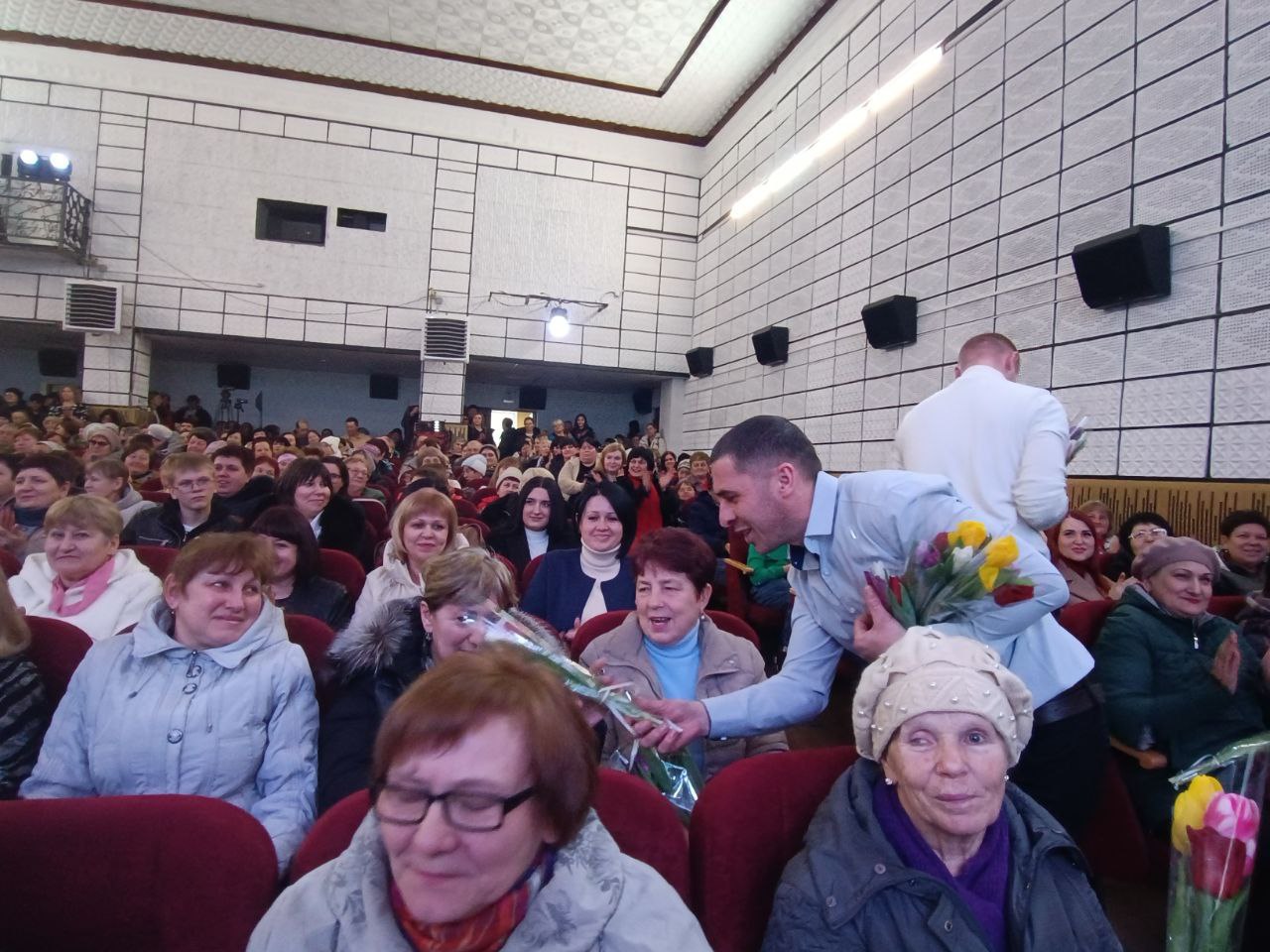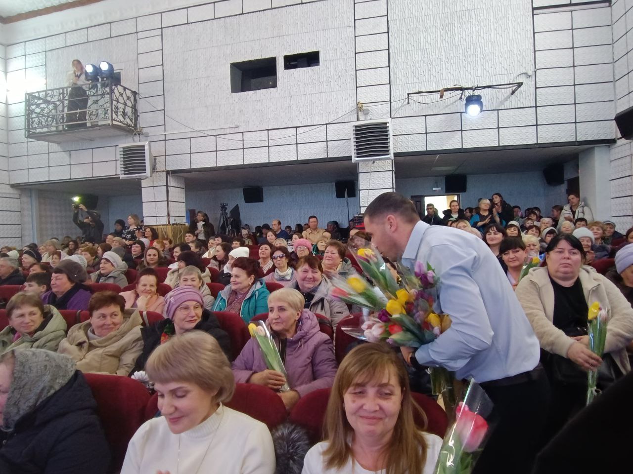 От губернатора региона-шефа Липецкой области Артамонова И. Г. все женщины в зале получили приятный подарок - букеты ароматных тюльпанов.