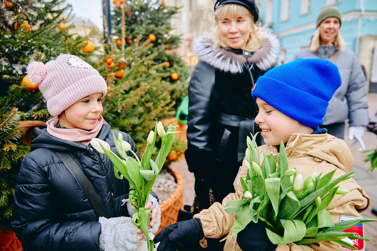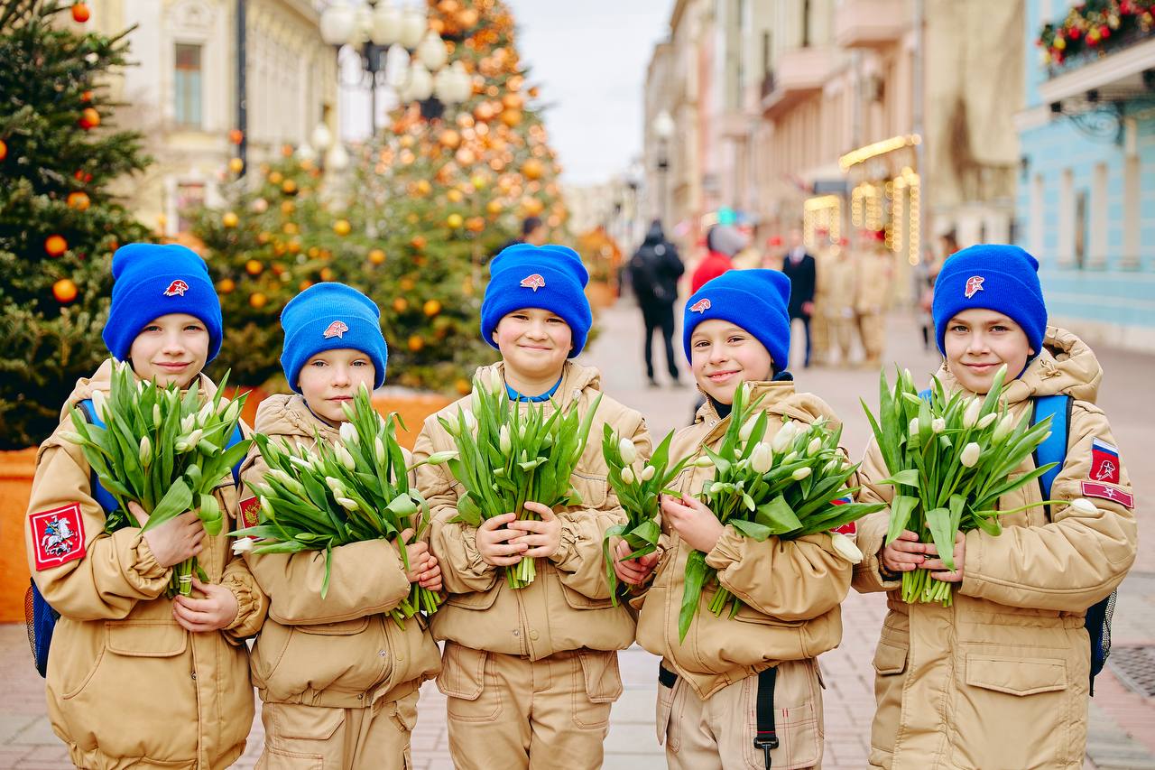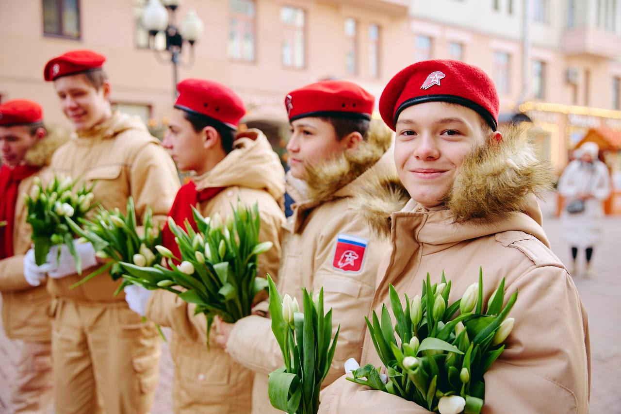 На улице Арбат в Москве Владислав Головин вместе с юнармейцами поздравили женщин с праздником