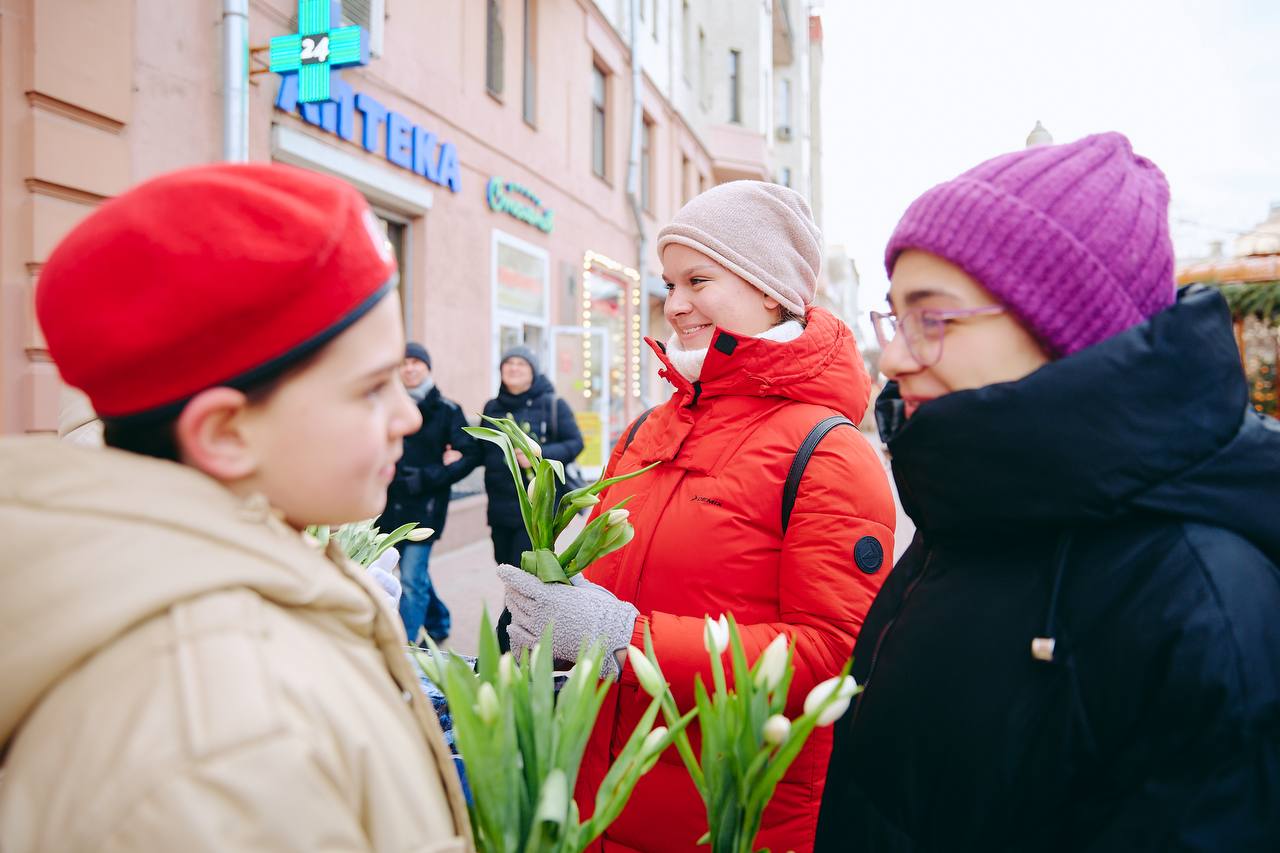 В Международный женский день ребята вместе с Героем России и Начальником Главного Штаба «ЮНАРМИИ» приняли участие в акции «Километр красоты» и вручали женщинам цветы.