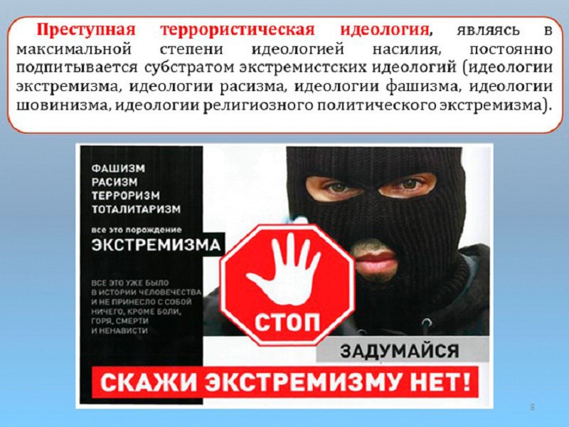 Эти действия опасны для общества и противоречат закону, поэтому в России действует ряд мер по противодействию идеологии терроризма и экстремизма.